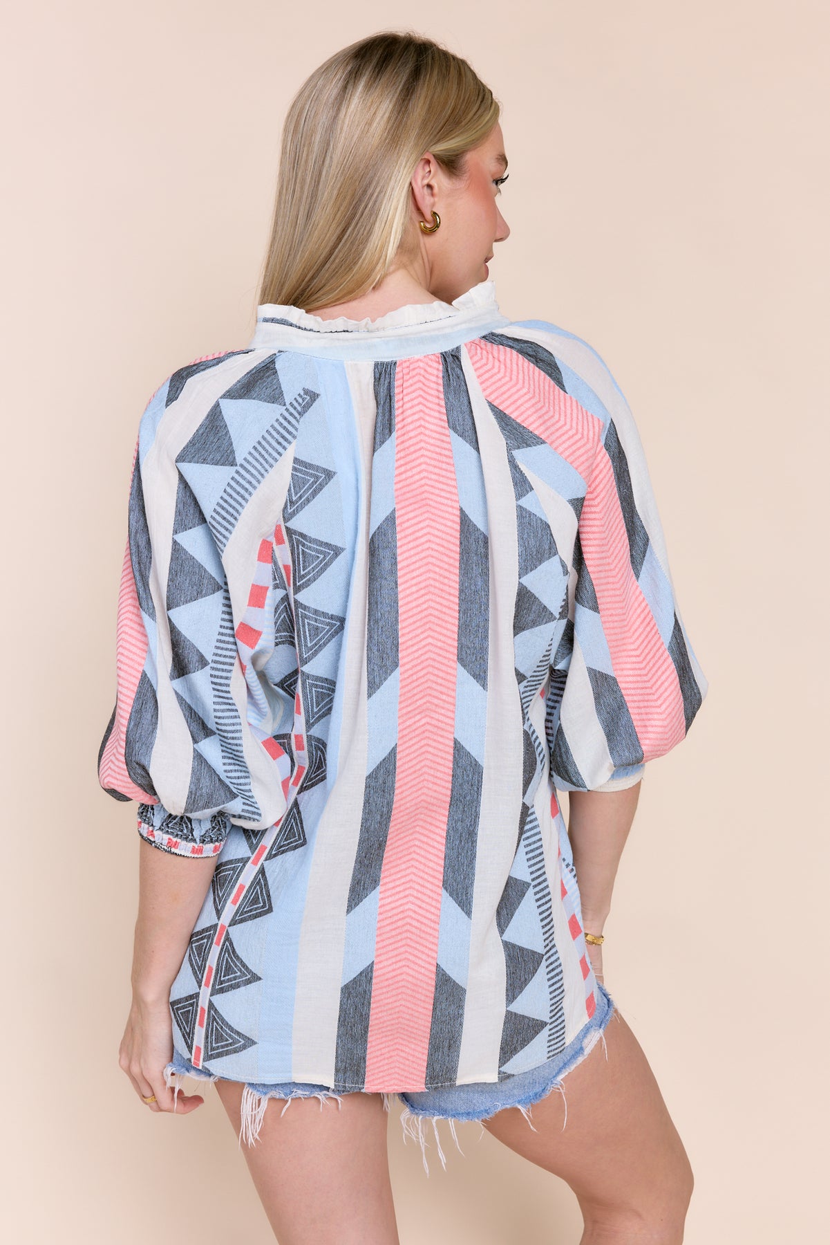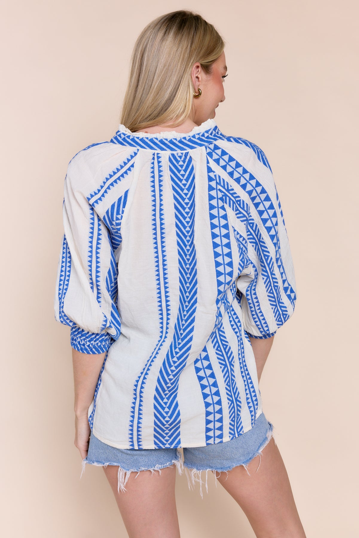 The blouse features a relaxed, slightly oversized fit and a chic V-neckline with a delicate banded collar. The  embroidery pattern, giving it a fresh, coastal-inspired look. Voluminous sleeves with a subtle cuff add a touch of romance and volume.