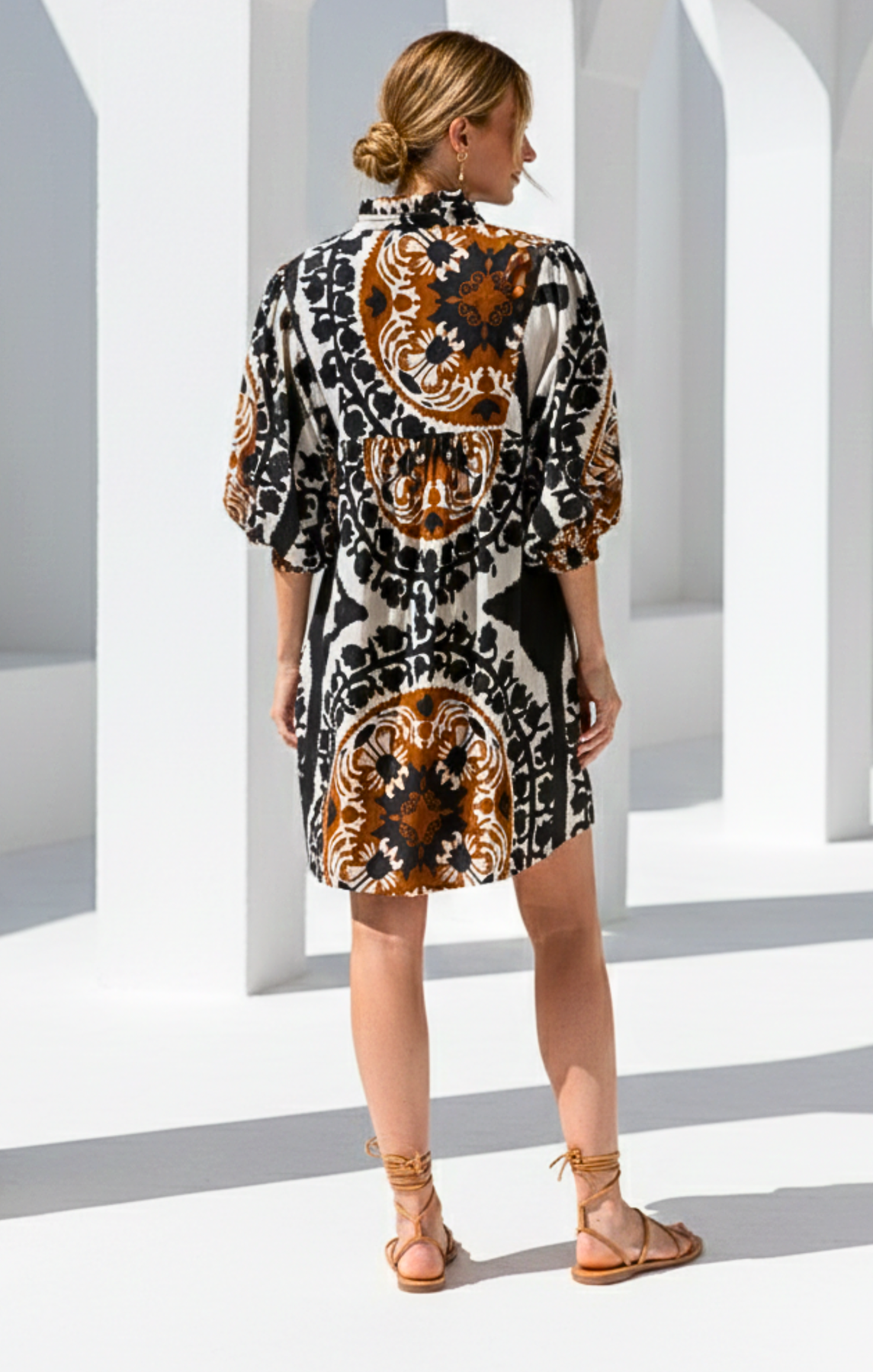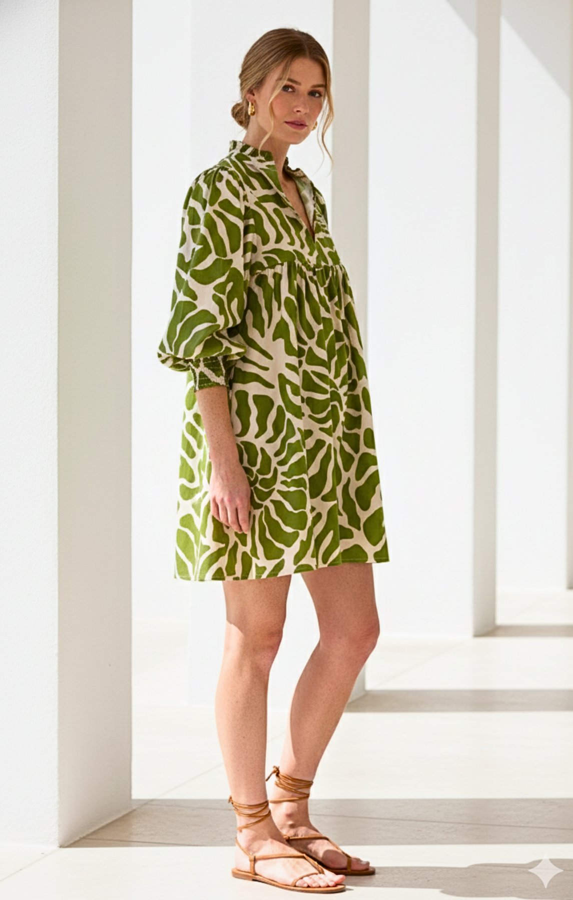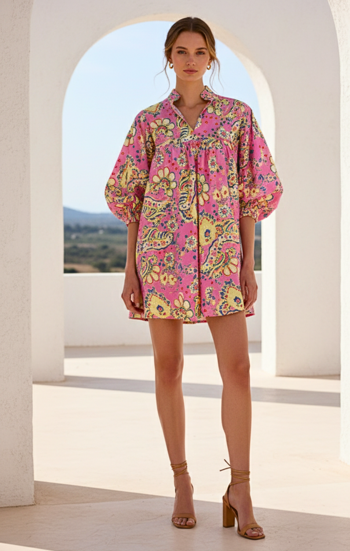 Step into the spotlight with our Jasper Print Resort Mini Dress, the epitome of sophisticated vacation wear. This stunning A-line mini dress features a vibrant, intricate patterns i It's a statement piece designed to transition seamlessly from a sunny resort lunch to an elegant evening out.