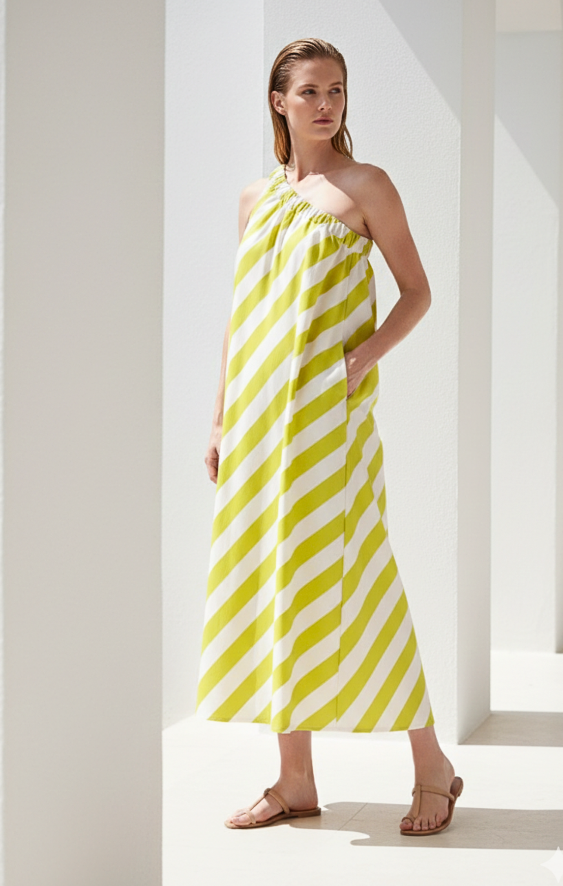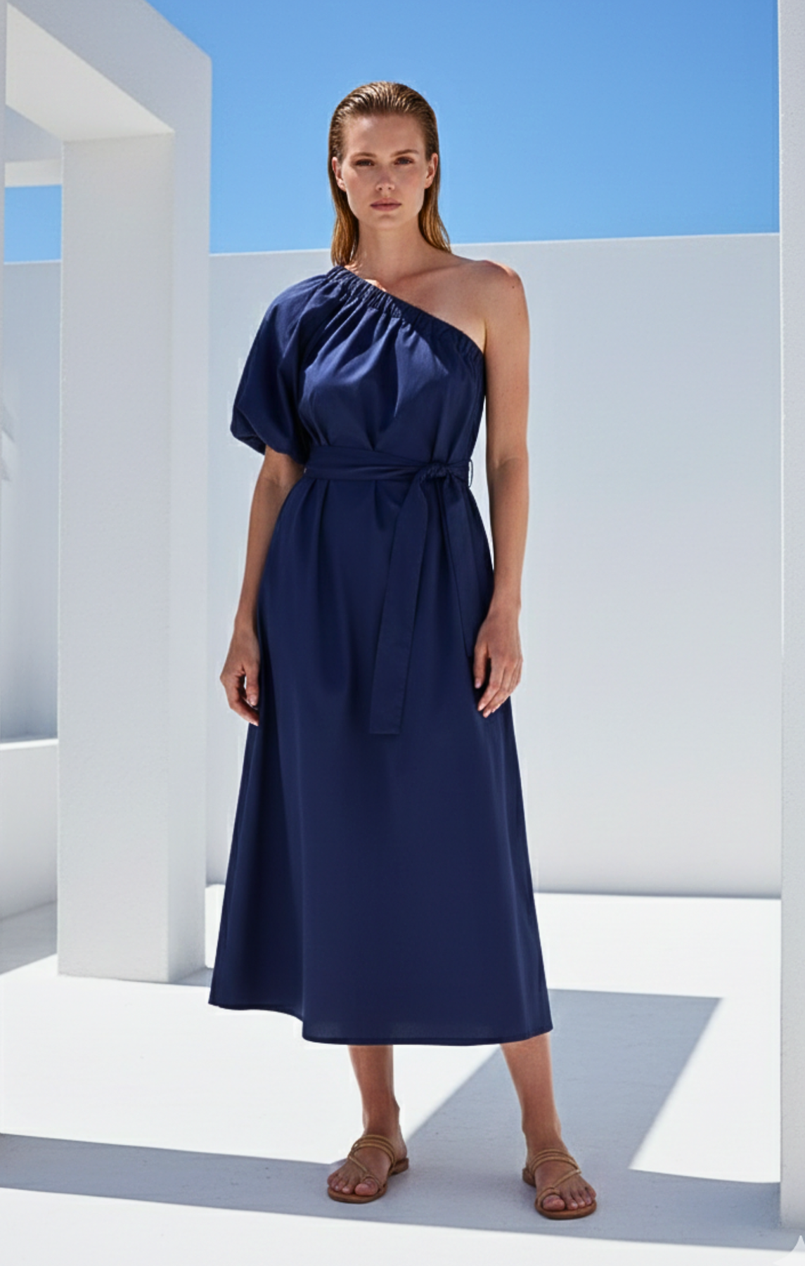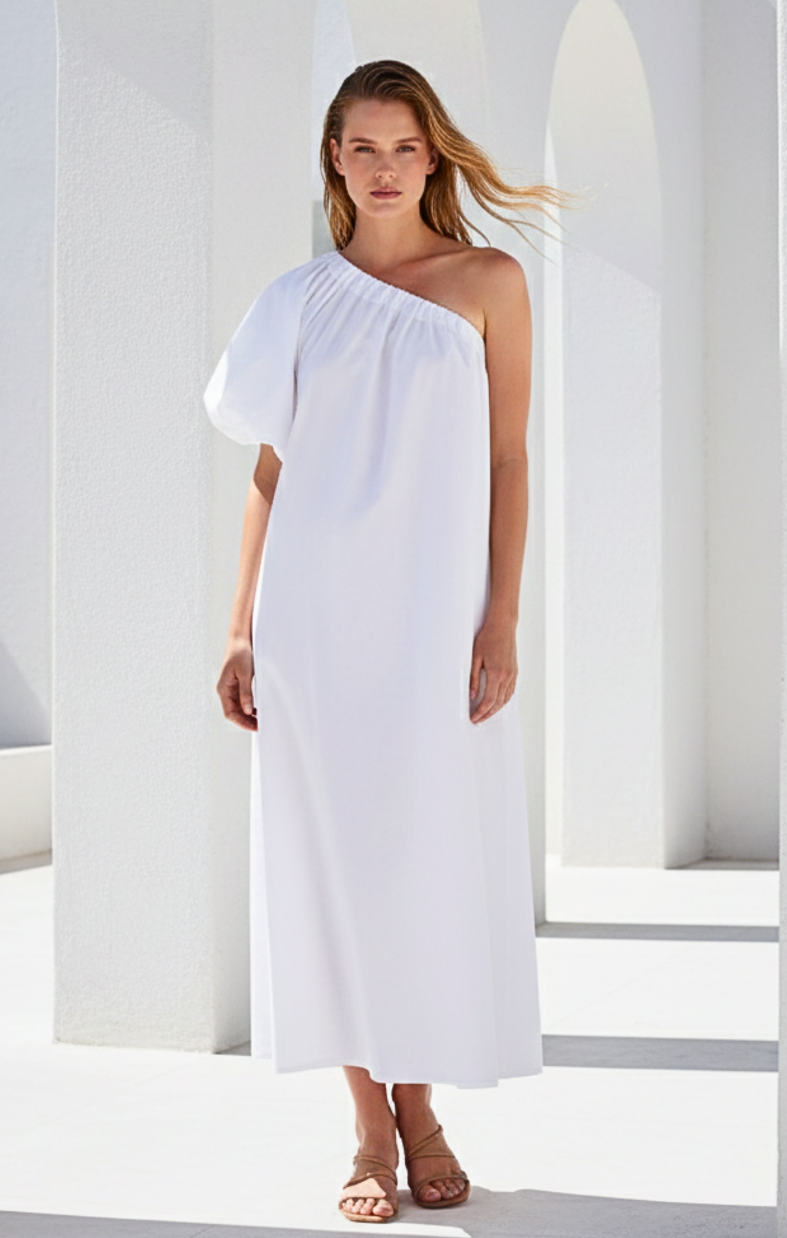 Turn heads in our One-Shoulder Maxi Dress. This effortlessly chic cotton blend dress features a dramatic one-shoulder neckline with a puff sleeve and a flowy, relaxed silhouette. Perfect for your next vacation, resort getaway, or a chic summer event Comfortable, forgiving, and universally flattering for all body types, The perfect beach-to-dinner look; just swap your sandals for heels!