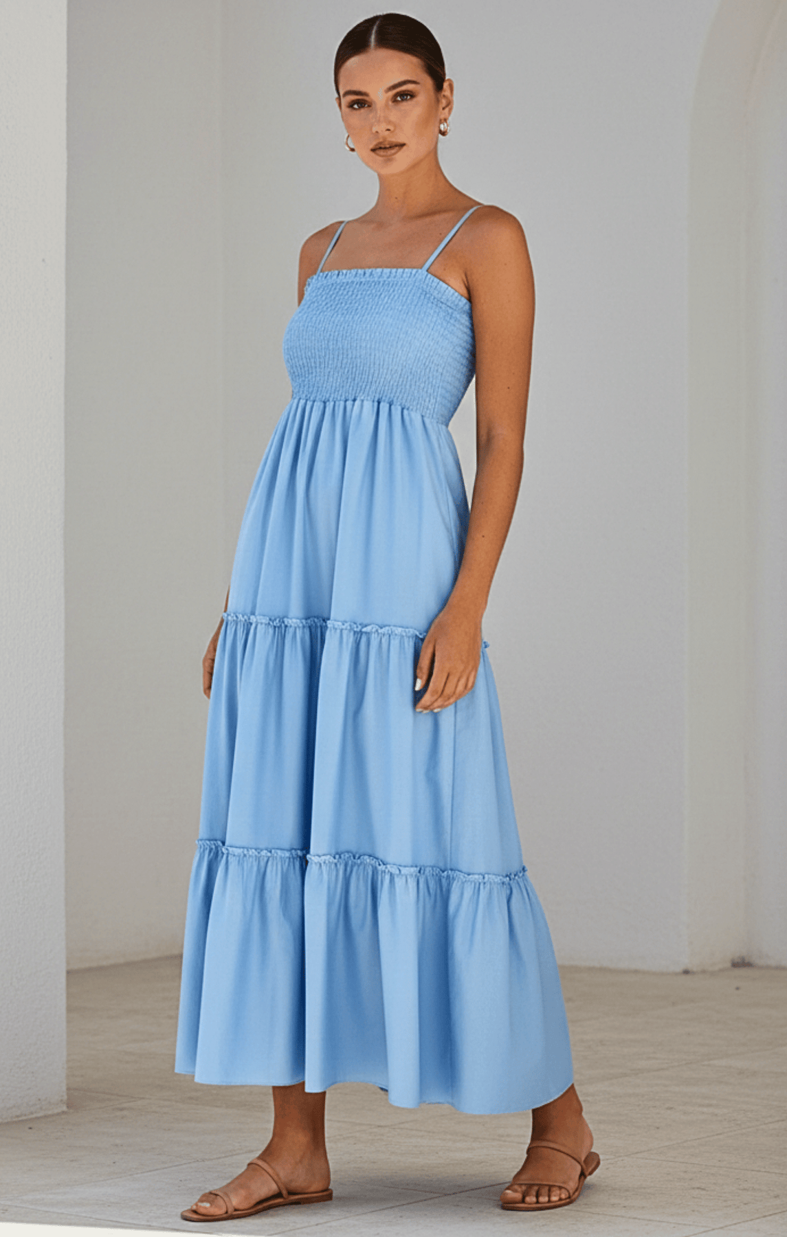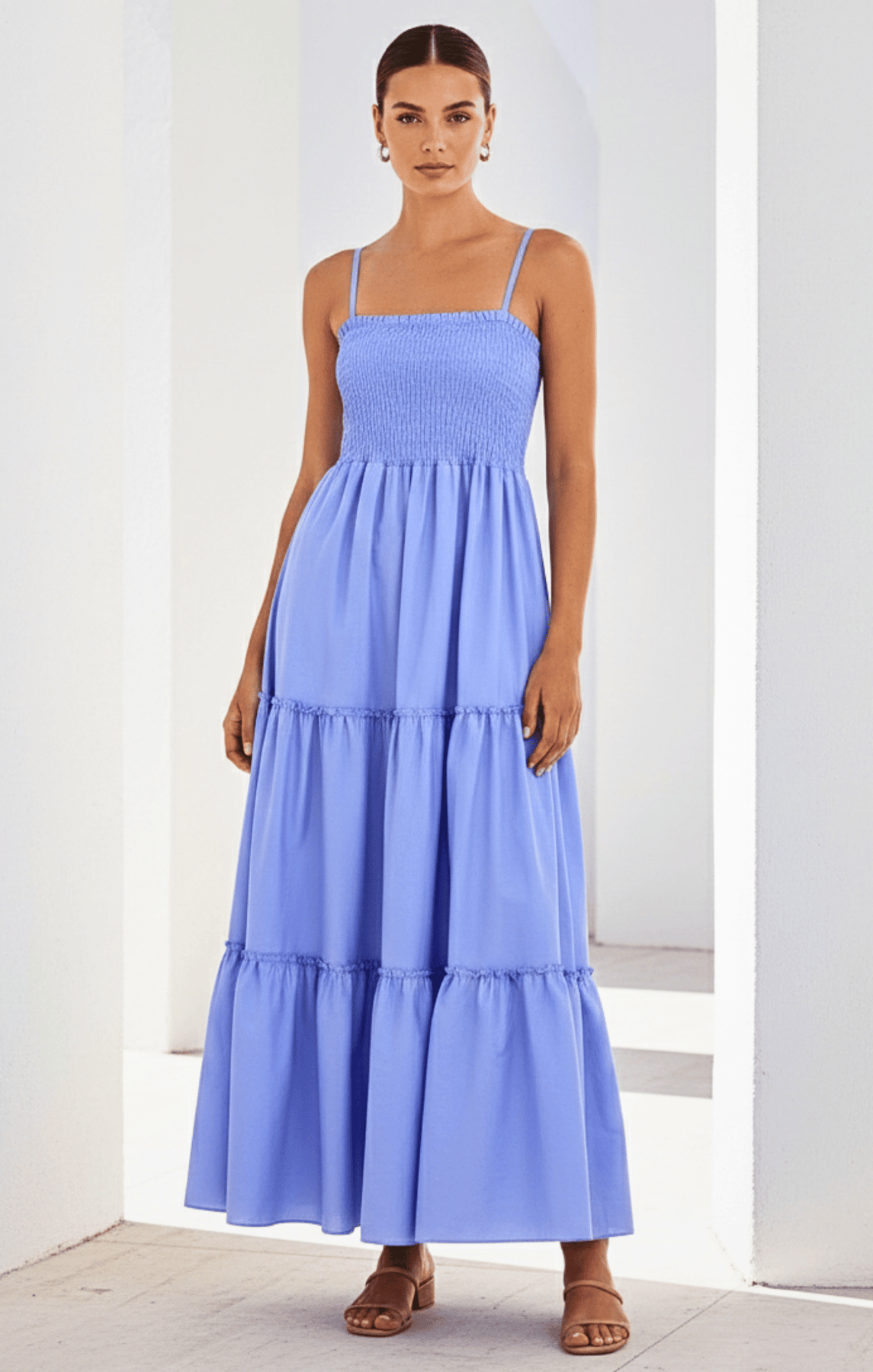 Embrace sun-drenched days and breezy evenings in our Cypress Tiered Maxi Dress. The bodice is designed with smocked elastic detailing for a comfortable, custom fit that highlights the waist, while the delicate spaghetti straps and square neckline add a touch of modern minimalism. The skirt falls into a graceful three-tier silhouette, providing beautiful movement and a relaxed, airy feel. Whether you’re attending a garden wedding or strolling along the coast, this maxi dress offers a perfect blend of sophisticated style and bohemian charm.