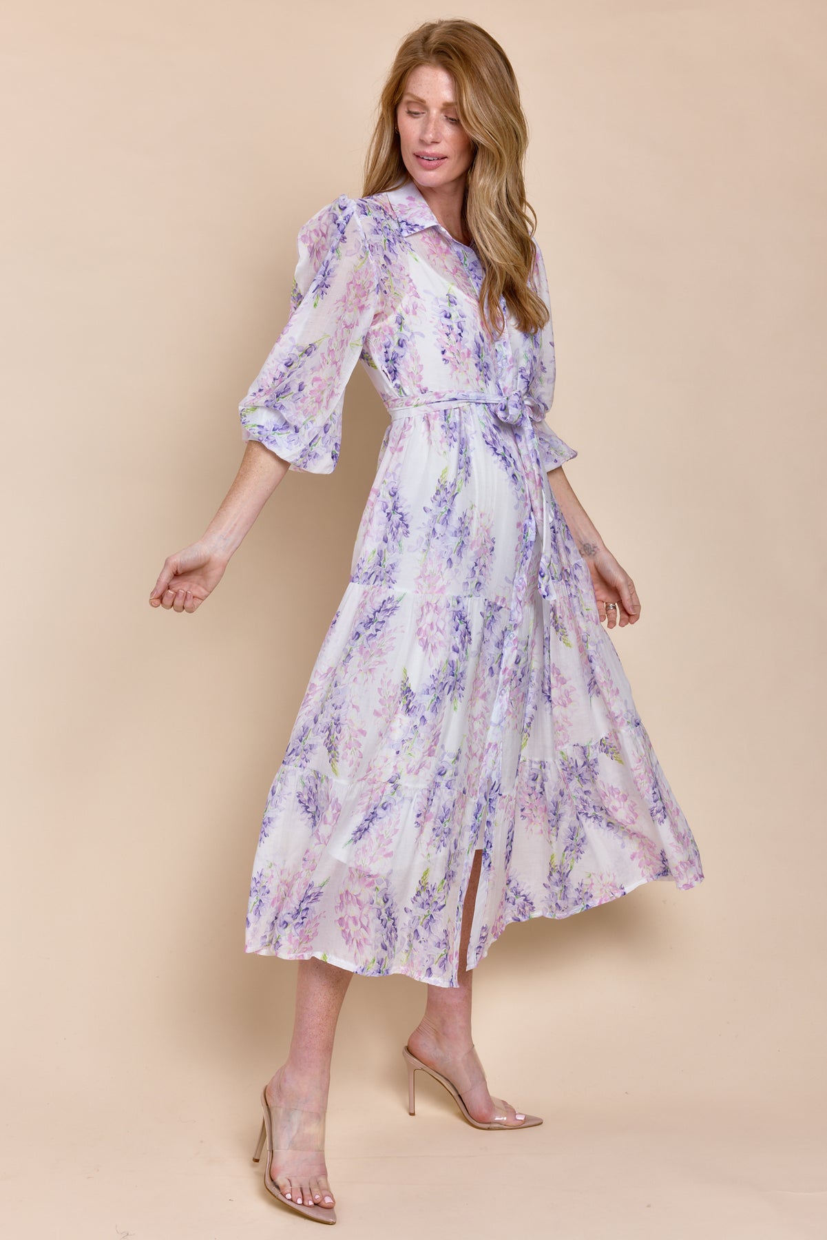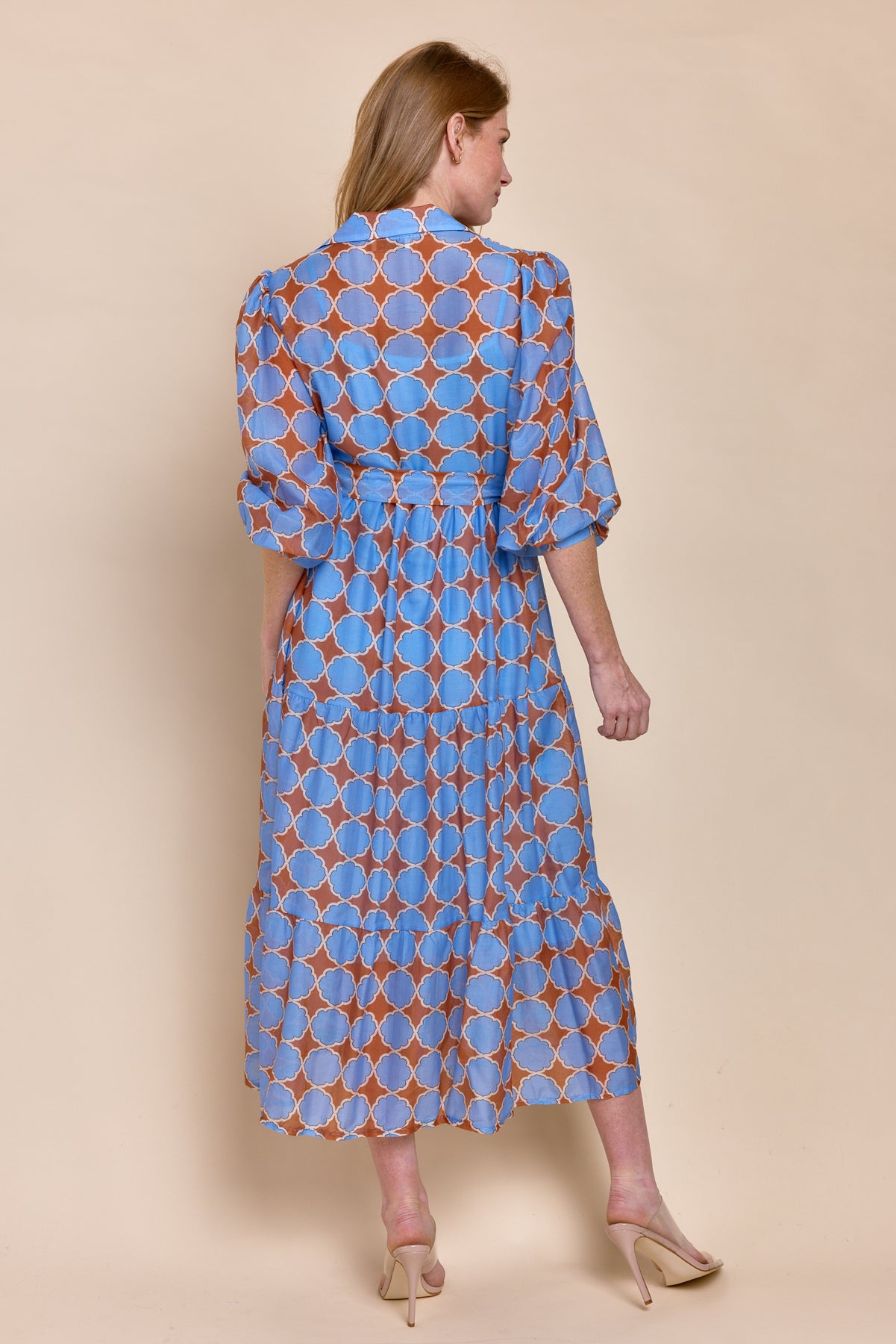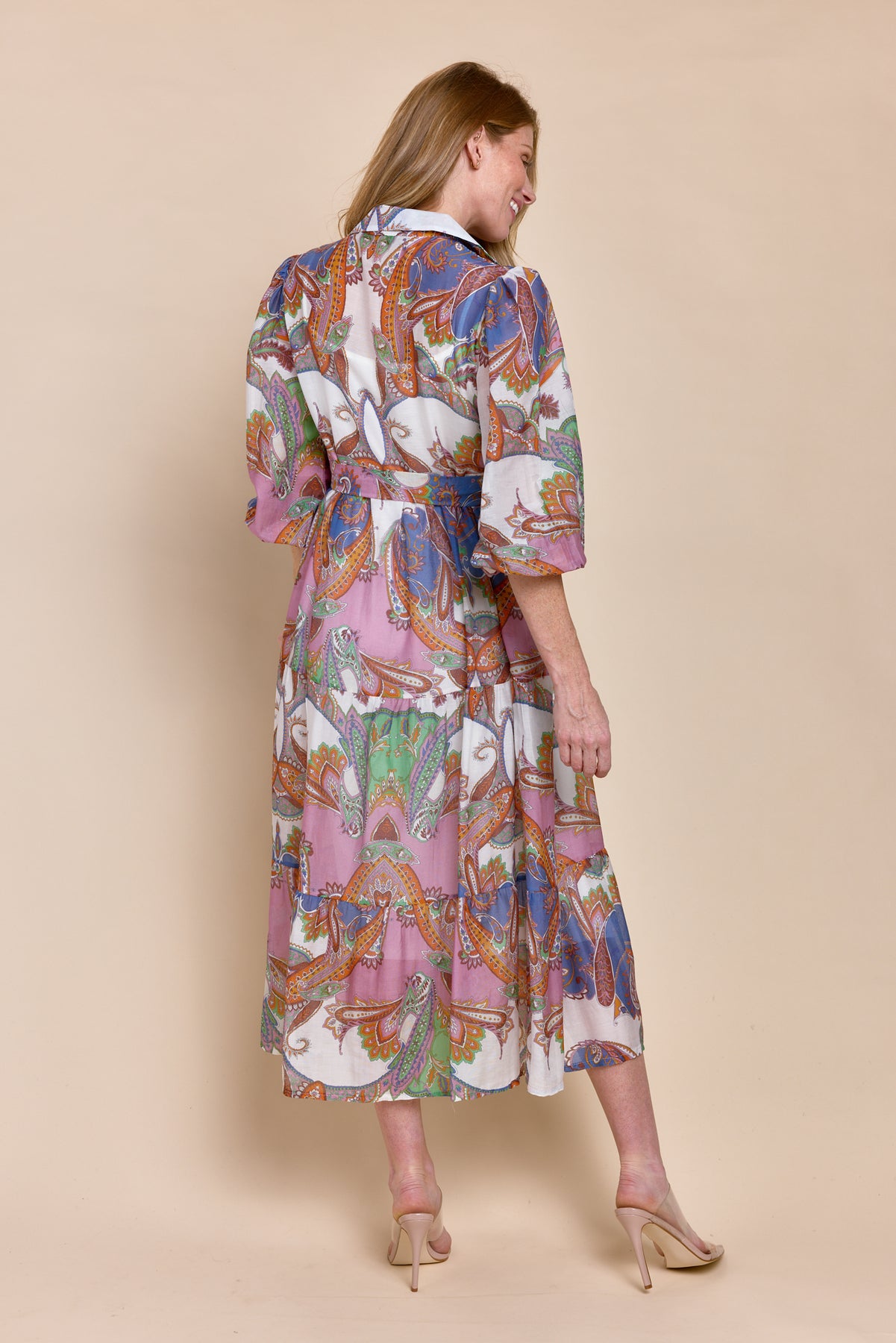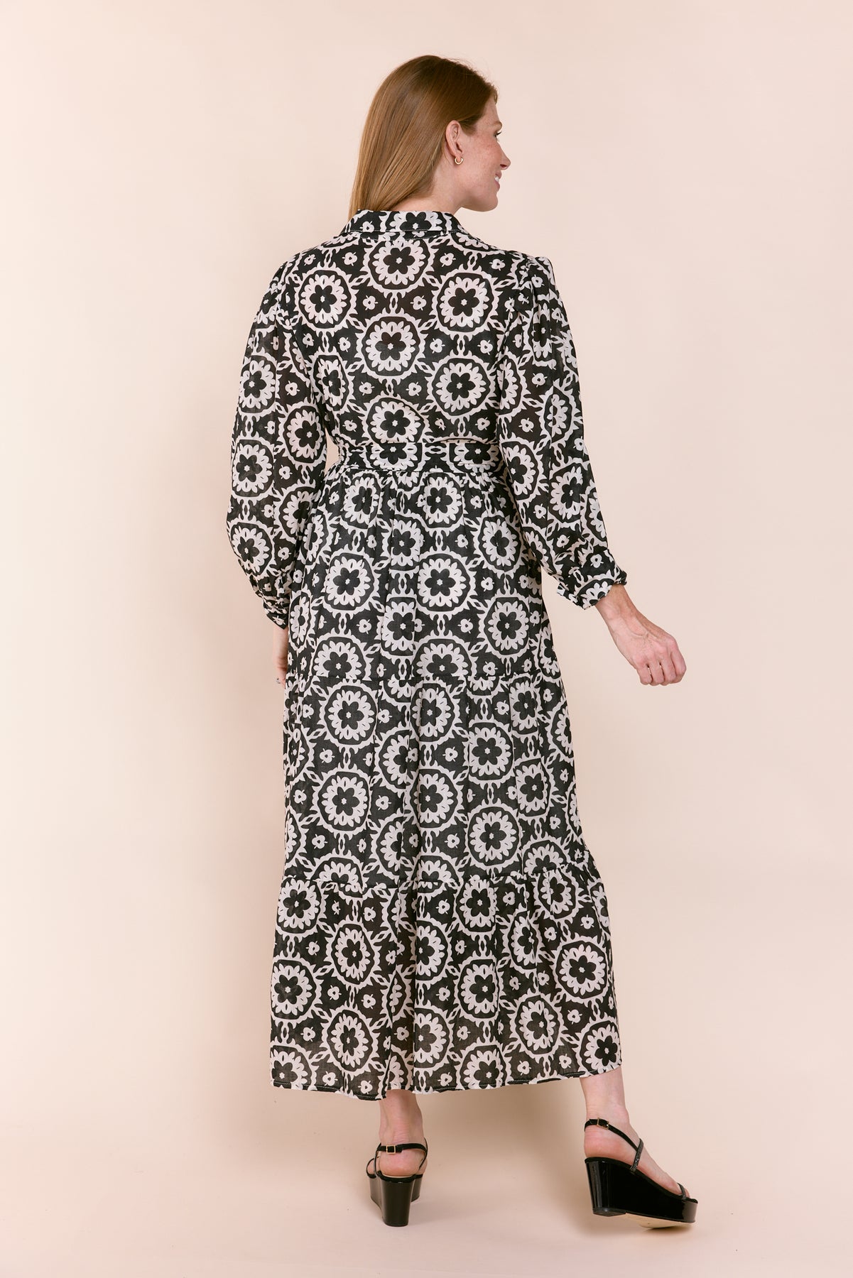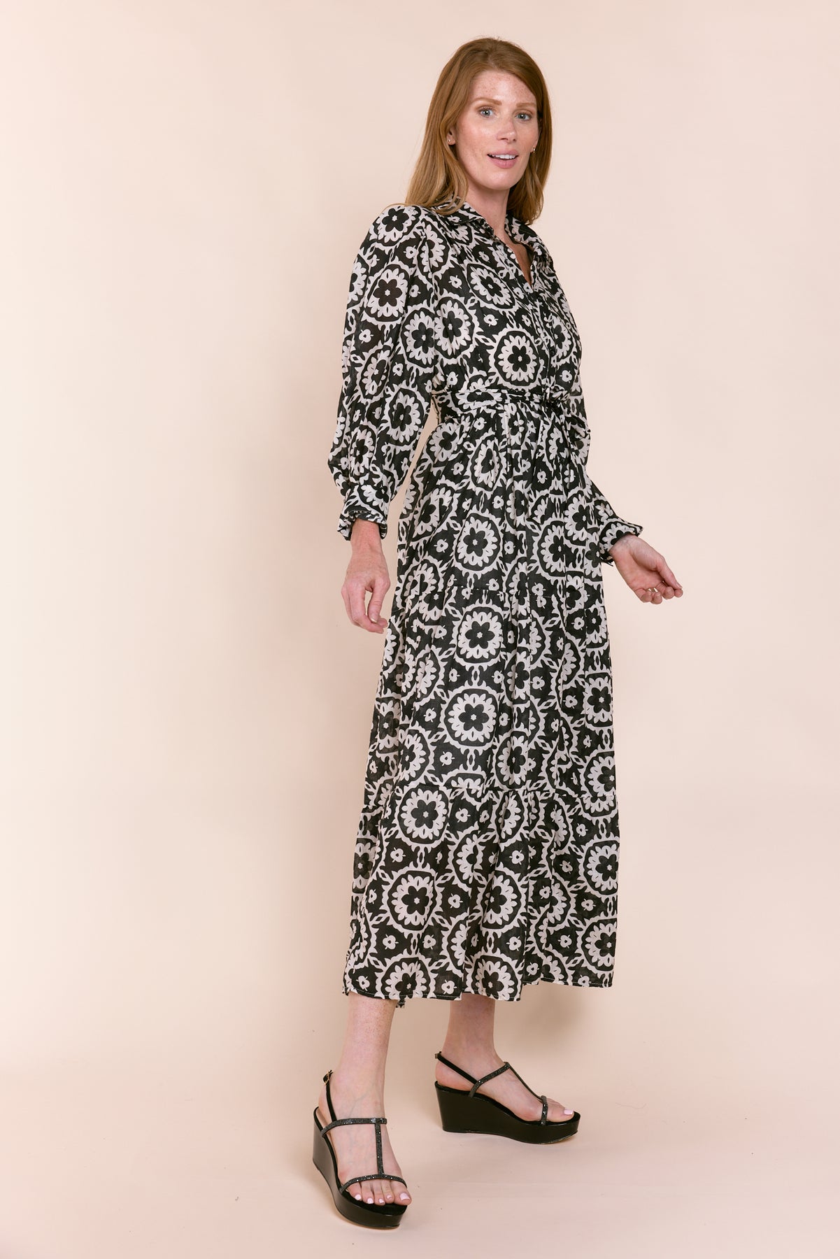 Featuring a tiered maxi skirt combined with puff sleeves , The Koss Dress is the perfect transitional piece, ready to quickly become a closet staple. With a collared neckline and half front placket, this effortless piece evokes a sophisticated, relaxed feel. This no fuss maxi can be worn all day from school drop offs and errands to dinners with old friends, making your day a breeze with this easy silhouette. Style this neutral, yet striking number with heels and raffia accessories for vacation or dress it down with classic white sneakers for everyday activities.
