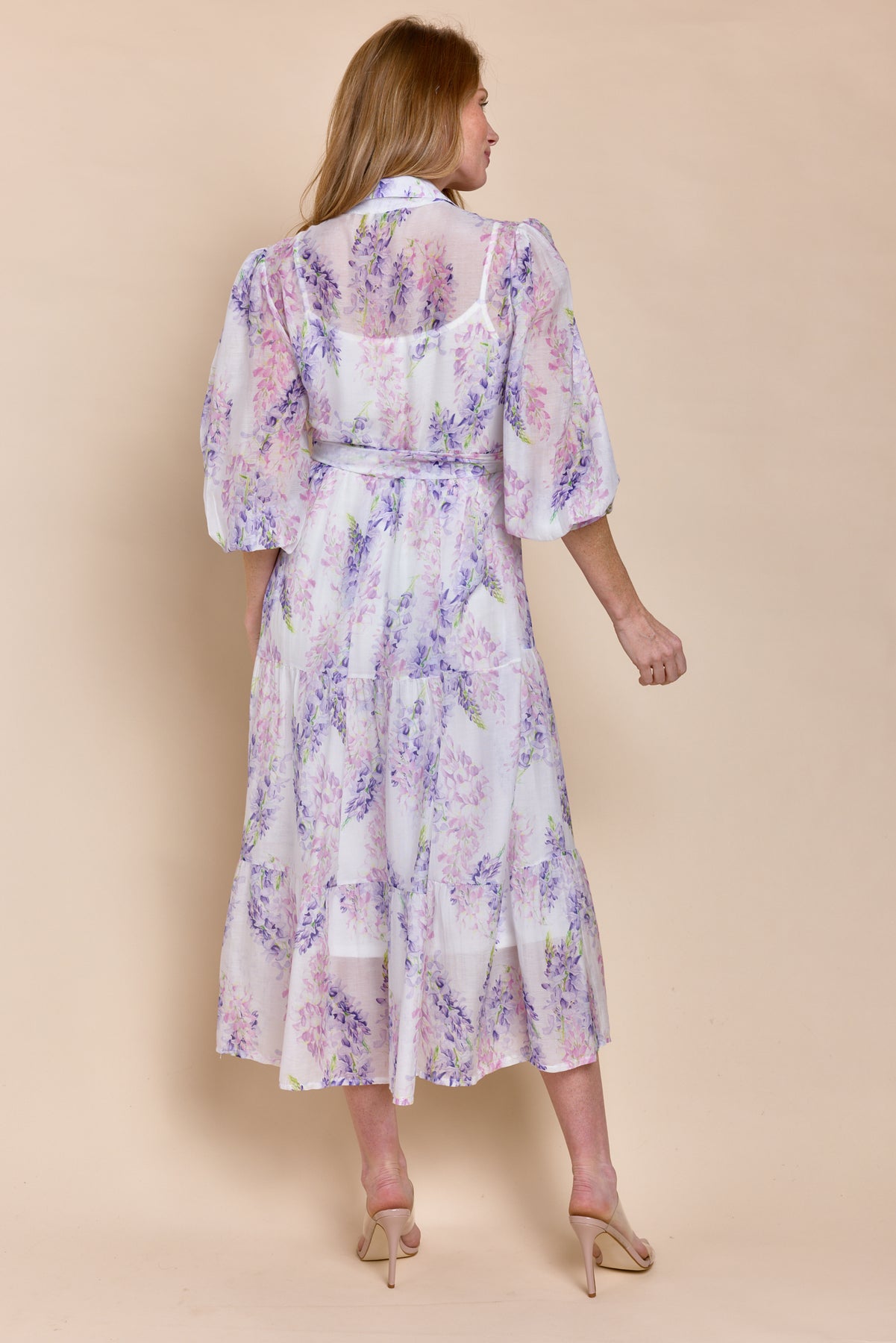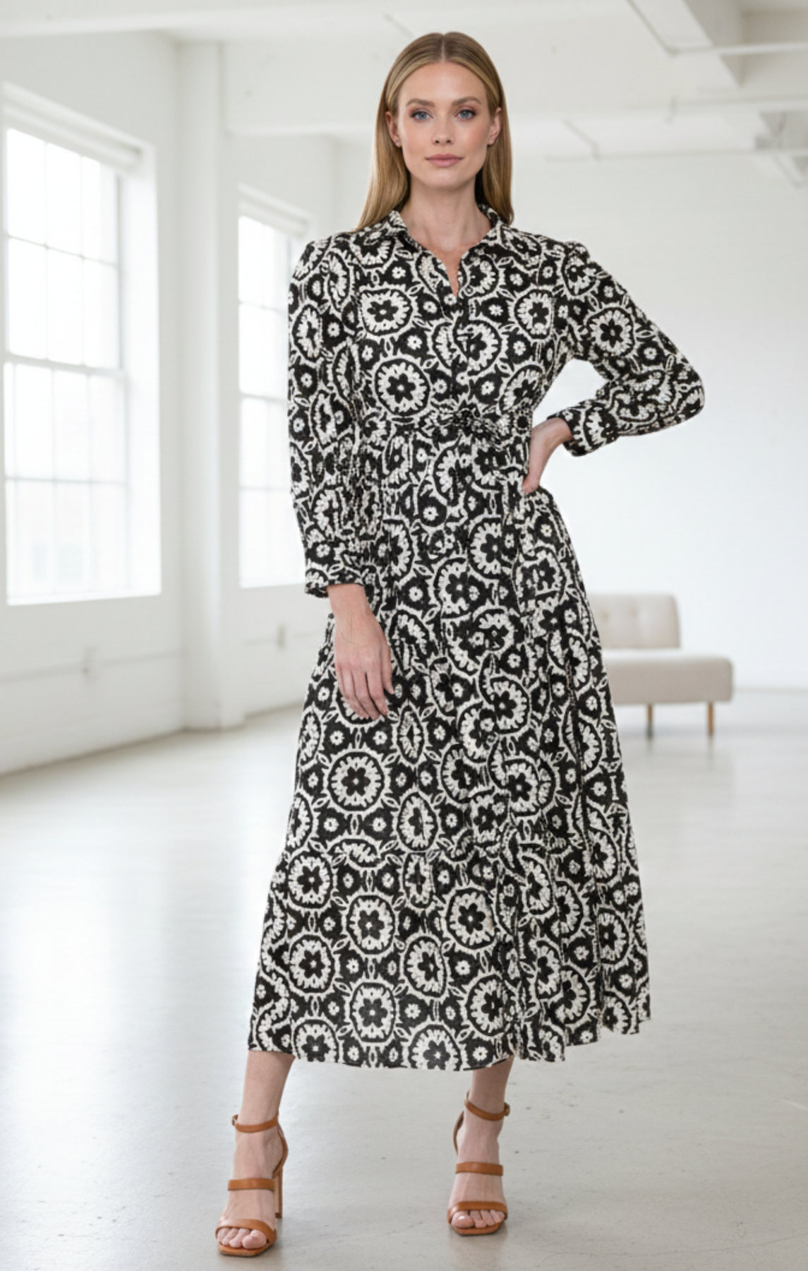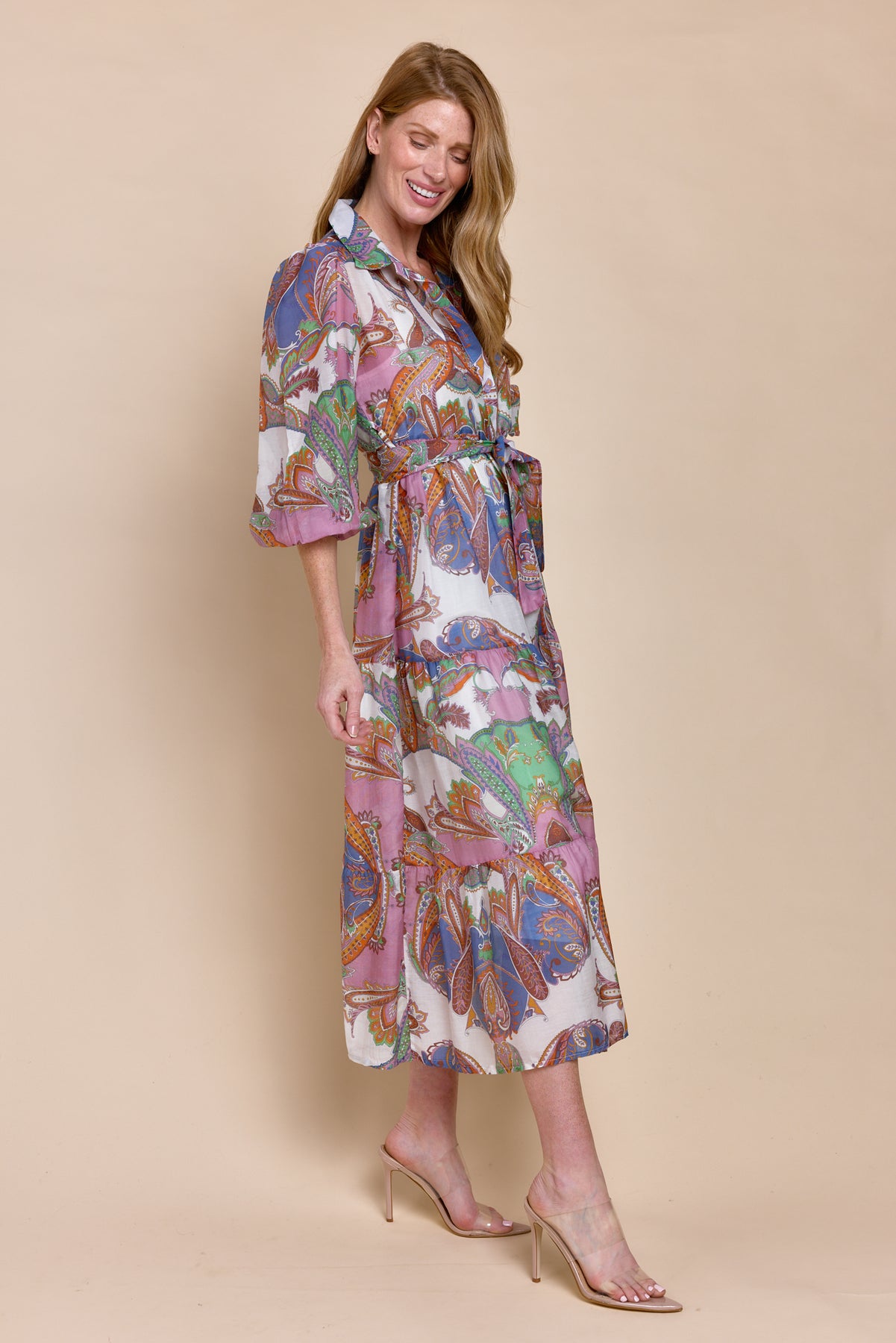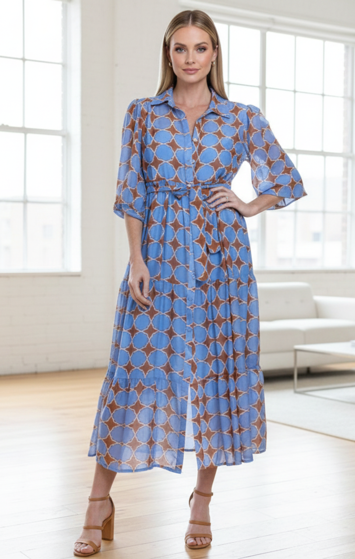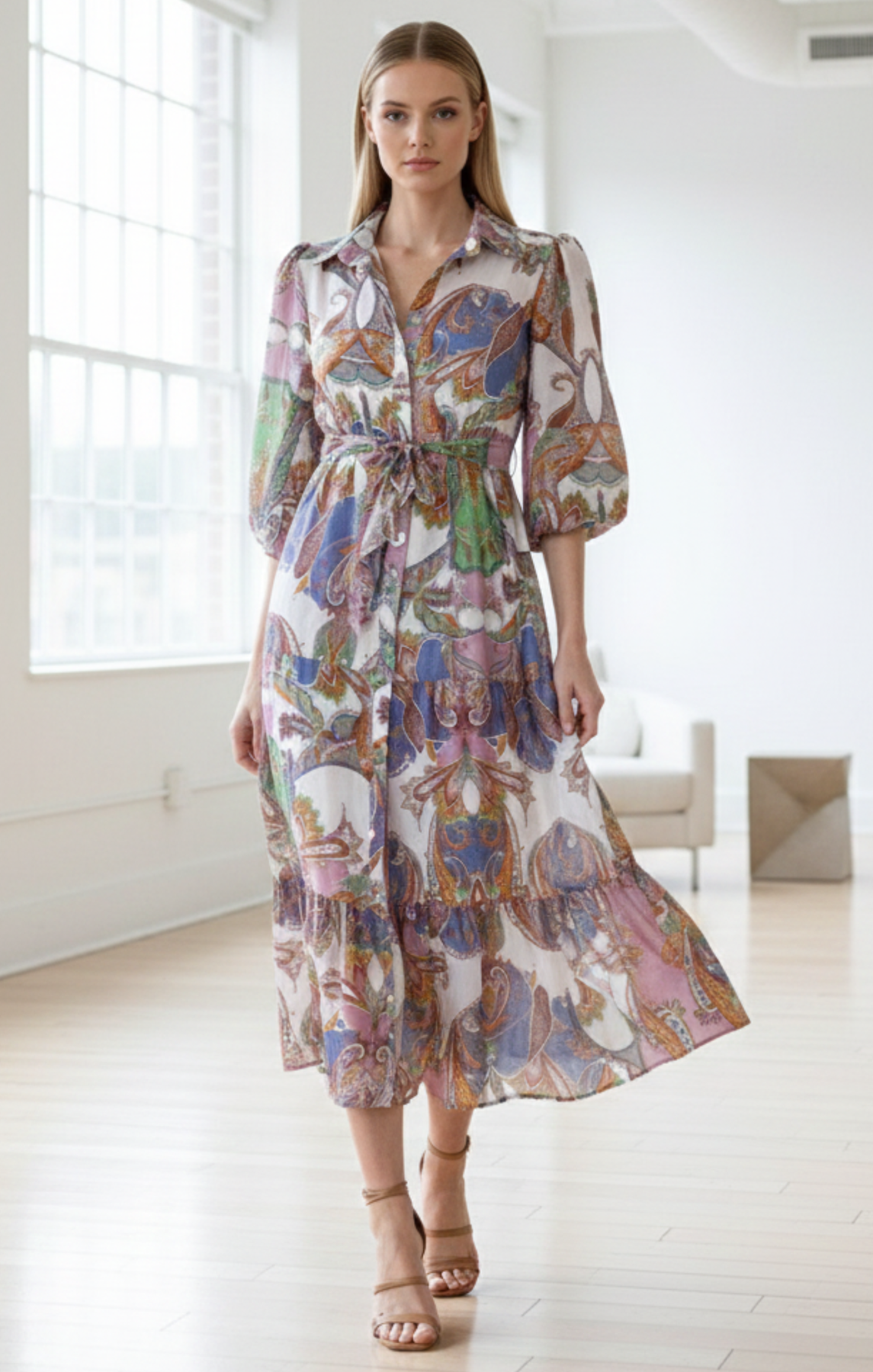 Featuring a tiered maxi skirt combined with puff sleeves , The Koss Dress is the perfect transitional piece, ready to quickly become a closet staple. With a collared neckline and half front placket, this effortless piece evokes a sophisticated, relaxed feel. This no fuss maxi can be worn all day from school drop offs and errands to dinners with old friends, making your day a breeze with this easy silhouette. Style this neutral, yet striking number with heels and raffia accessories for vacation or dress it down with classic white sneakers for everyday activities.