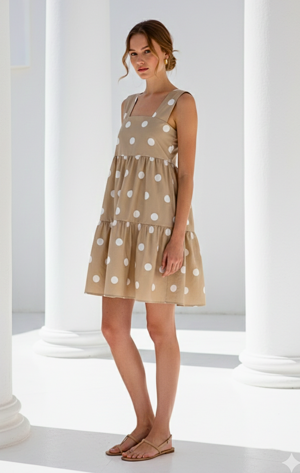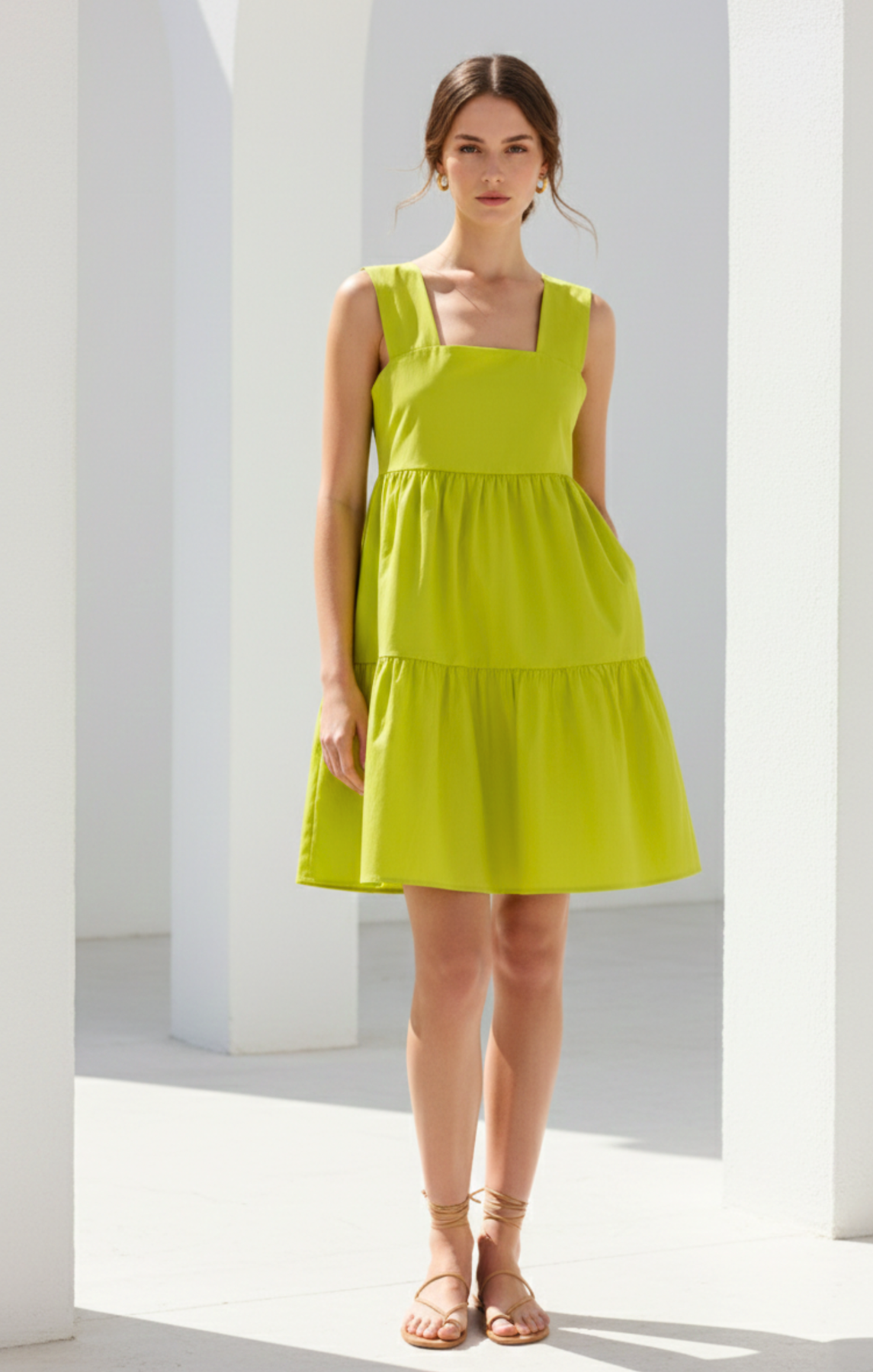 This vibrant dress is the ultimate "it-girl" piece for sunny days. It combines a bold, modern color palette with a timeless, feminine silhouette, making it a versatile staple for everything from beachside brunches to casual summer weddings. Capture the essence of summer in this tiered mini dress. Crafted from a crisp, breathable fabric cotton poplin, this dress features a structuredsquare neckline and wide, comfortable straps. The babydoll silhouette is defined by its breezy, multi-tiered skirt that offers effortless movement and a flattering, relaxed fit for all body types.