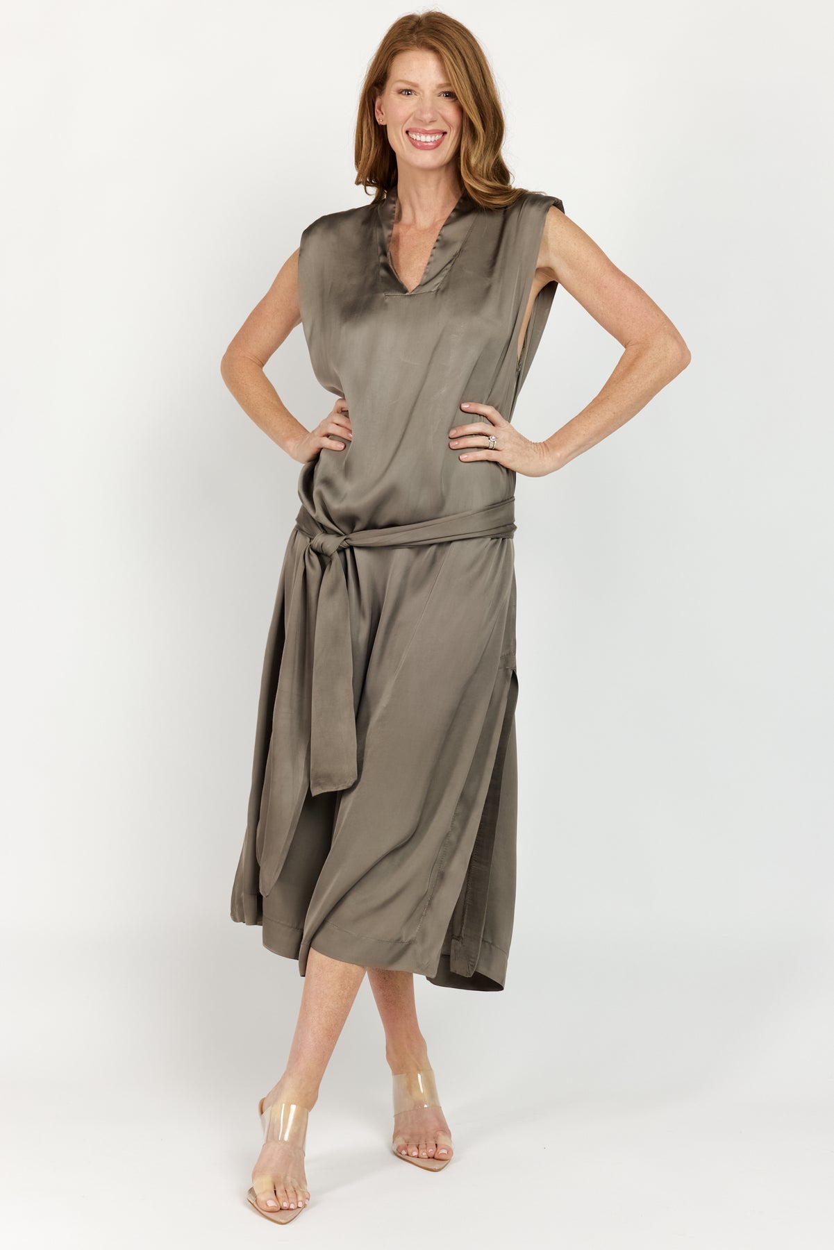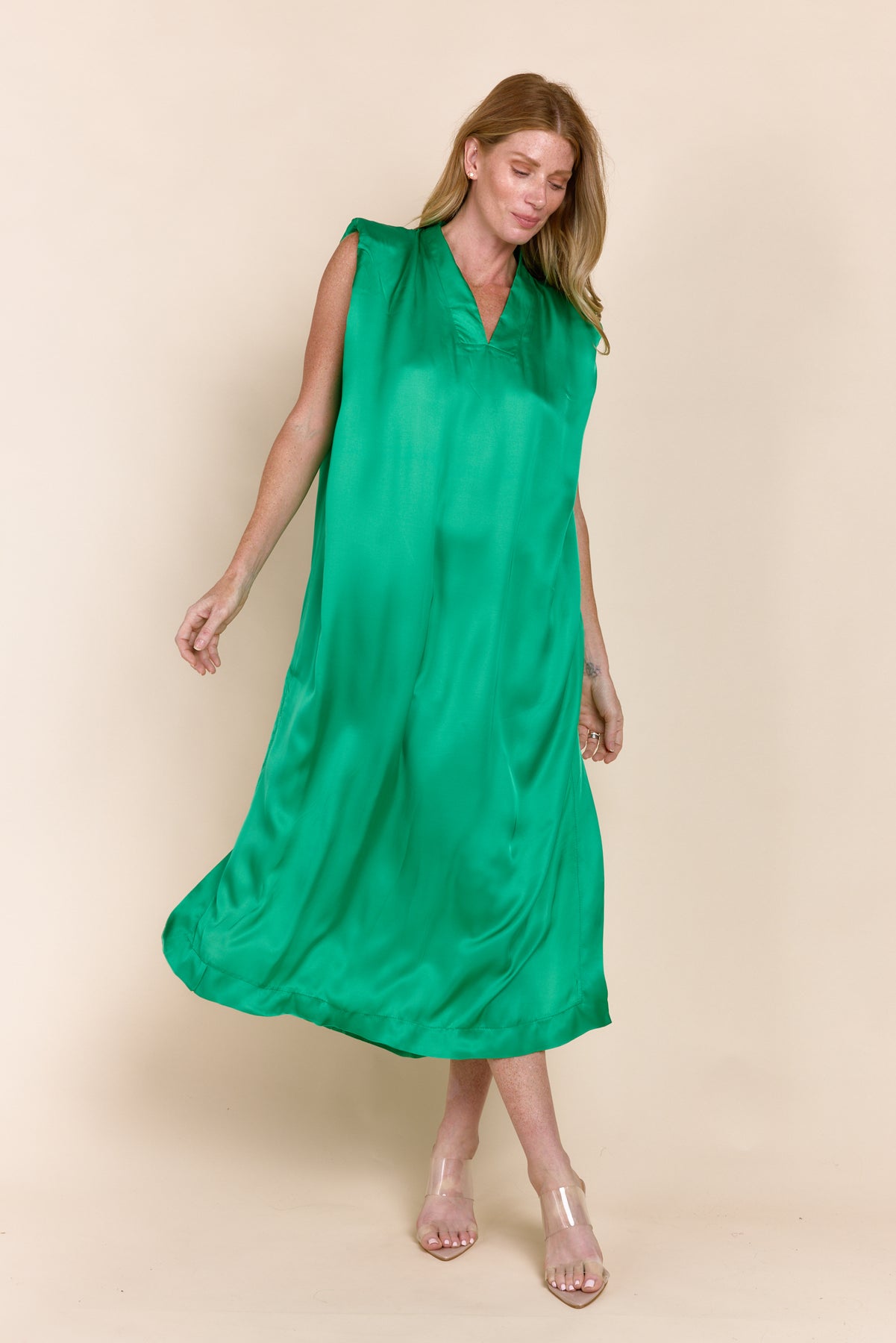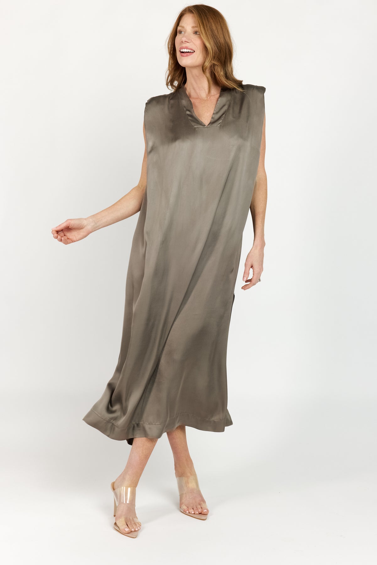 The Antonia Dress by Sofia is crafted from luxurious Italian satin and designed for fluid movement and elegant drape. Its relaxed silhouette flatters a range of body types, while a soft V-neckline and side slits add a touch of structure and shape. Unlined and organically hand-dyed, the dress is handmade in Italy and comes with a detachable satin belt for styling versatility—wear it loose for ease or cinched to define the waist.
