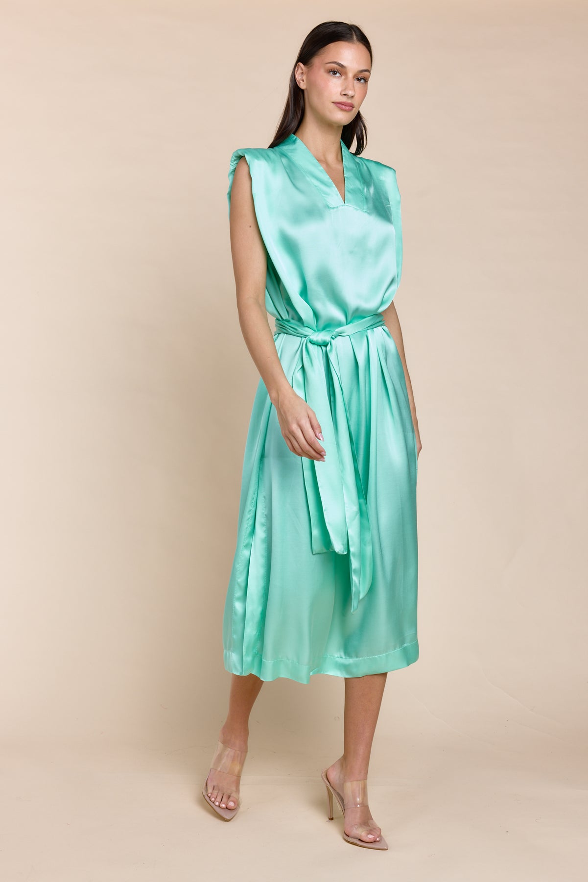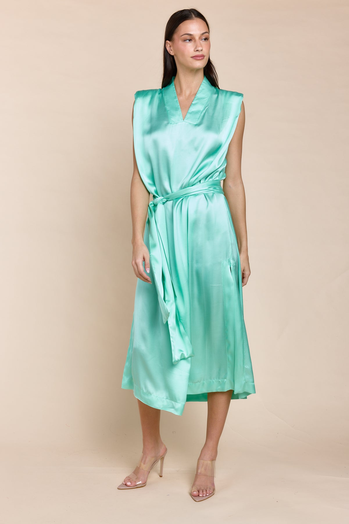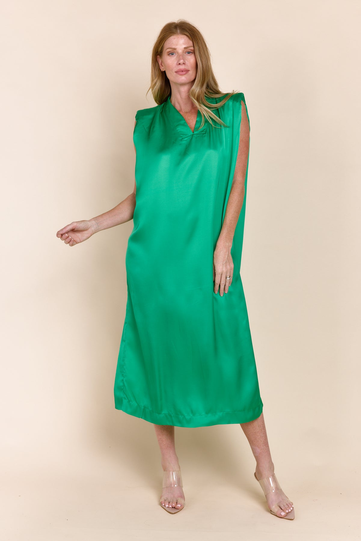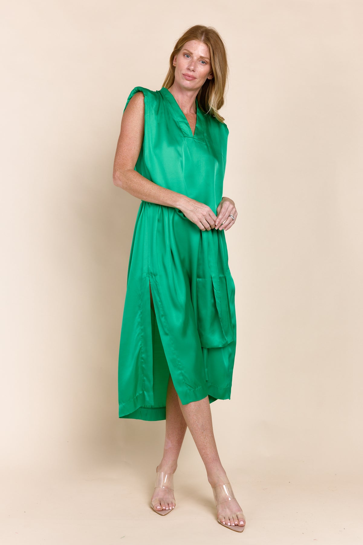The Antonia Dress by Sofia is crafted from luxurious Italian satin and designed for fluid movement and elegant drape. Its relaxed silhouette flatters a range of body types, while a soft V-neckline and side slits add a touch of structure and shape. Unlined and organically hand-dyed, the dress is handmade in Italy and comes with a detachable satin belt for styling versatility—wear it loose for ease or cinched to define the waist.