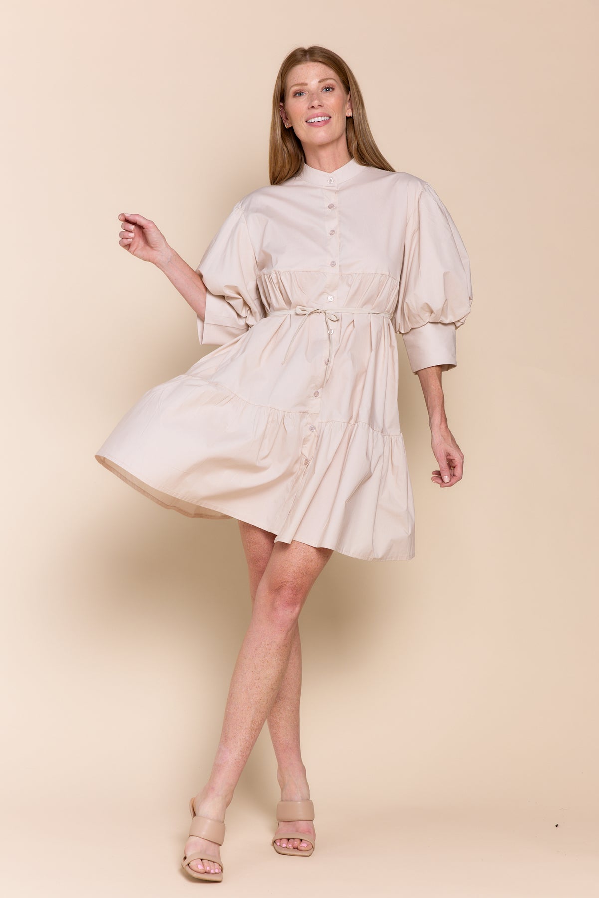 The classic shirtdress silhouette is elevated by modern, dramatic details. It features a chic mandarin collar, a full button-down placket, and, most notably, voluminous puff sleeves that add structure and style. A wide, self-fabric belt cinches the waist, creating a flattering contrast with the gathered, tiered mini skirt. This dress is a testament to sustainable luxury and the unparalleled craftsmanship that is genuinely made in Italy.