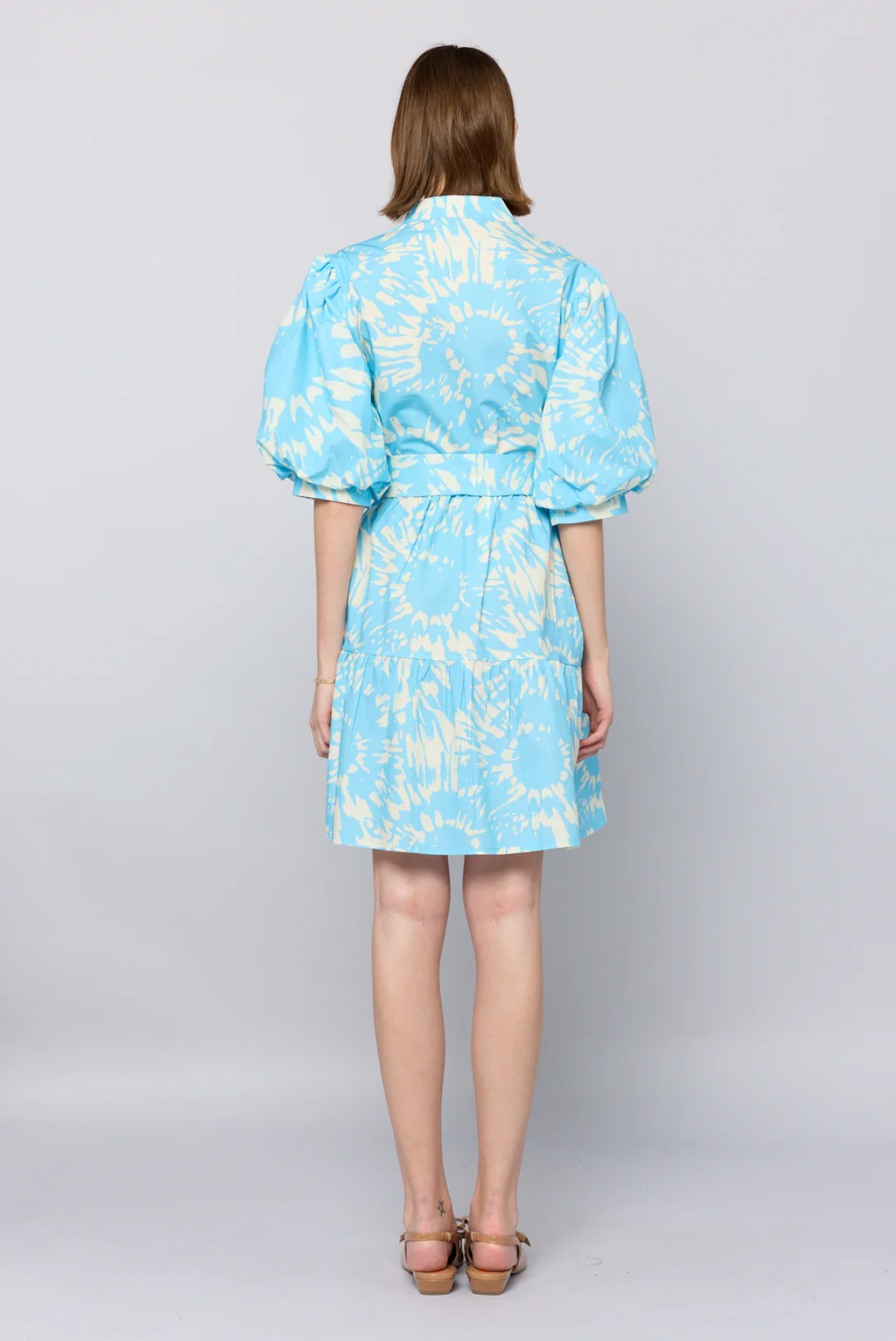 Woman wearing a light blue dress with white patterns on a plain background