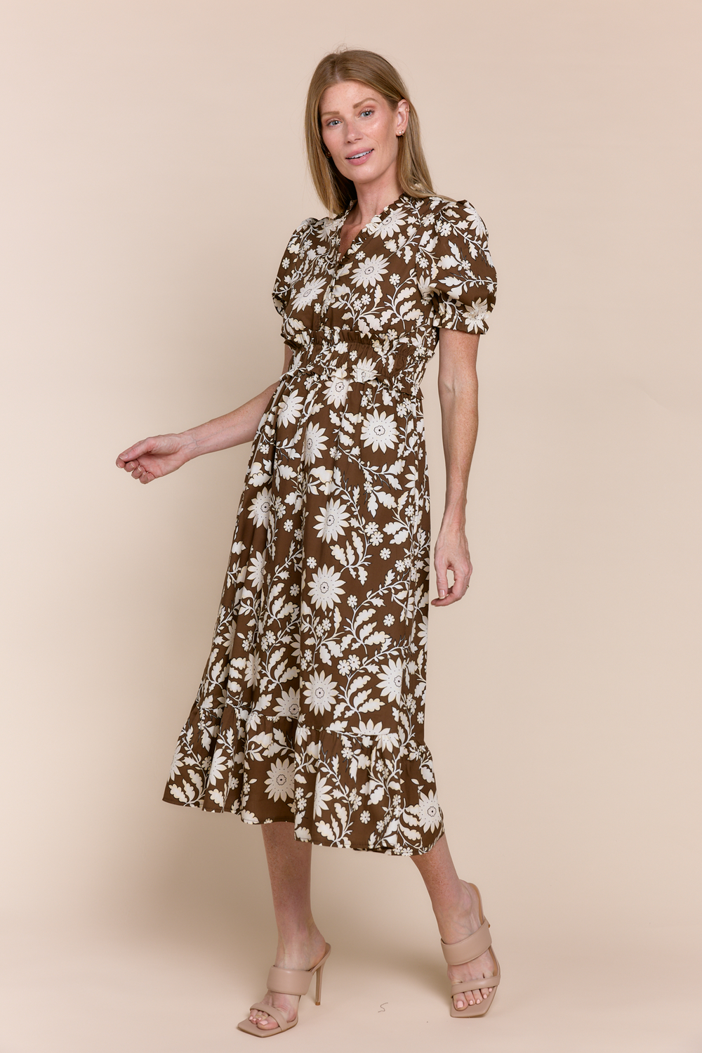 This silhouette boasts a  V-neckline with slightly puff sleeves, a fitted, elastic  waist,  , thoughtfully made from Italian poplin cotton to lend structural integrity to the flattering shape. Pair with neutral heel for bridal events, cocktail parties, or formal dinners.