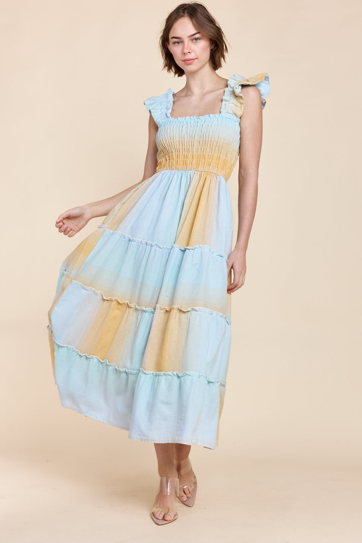 The bodice is crafted from a comfortable, smocked stretch fabric that provides a perfect, customized fit. Falling from the waist is a beautiful, tiered skirt  with pockets Maxi Dress.