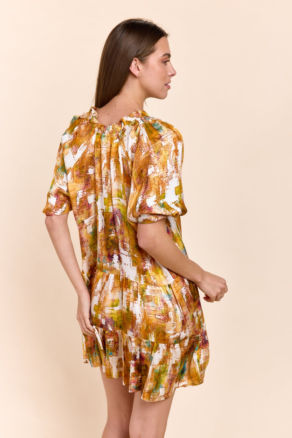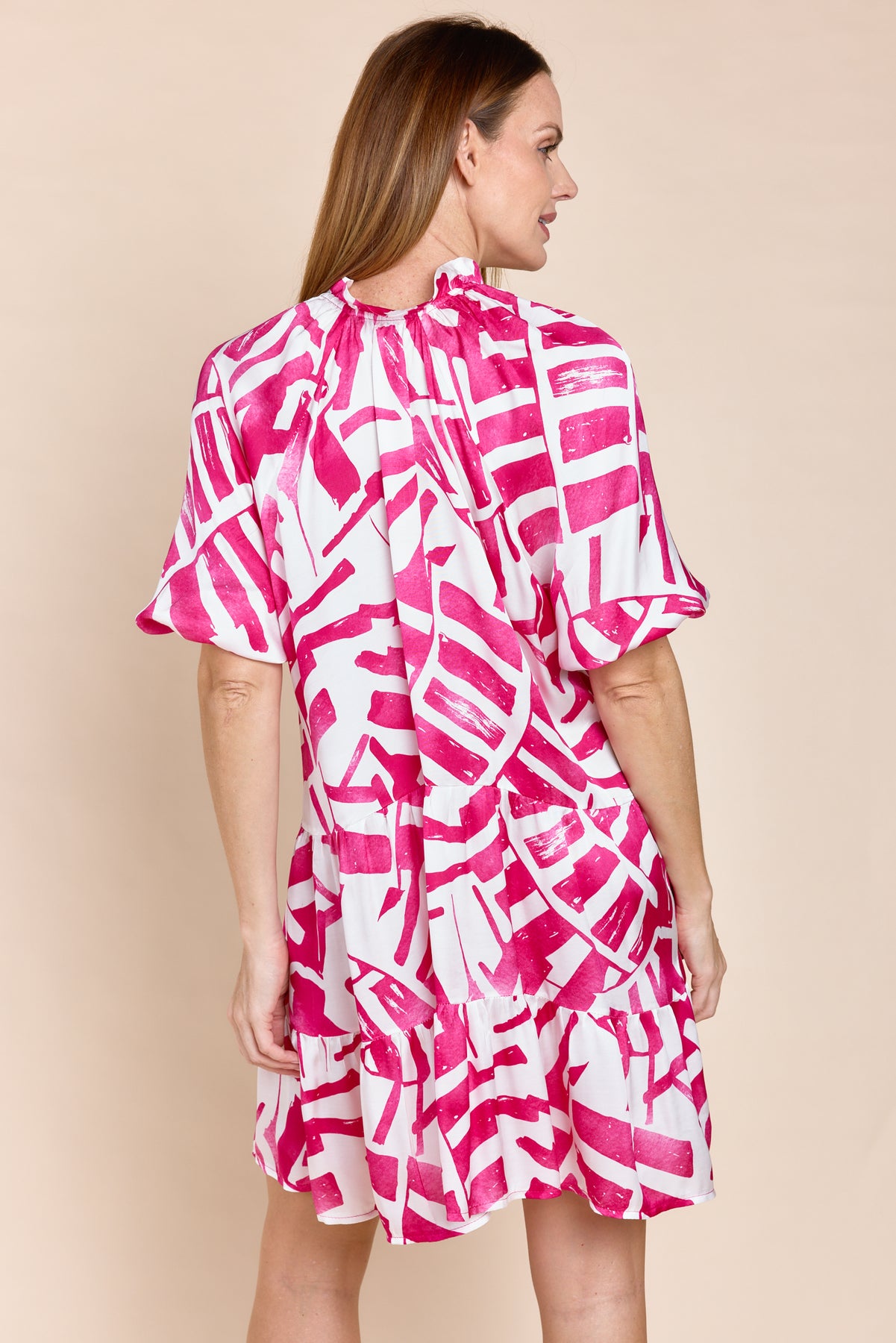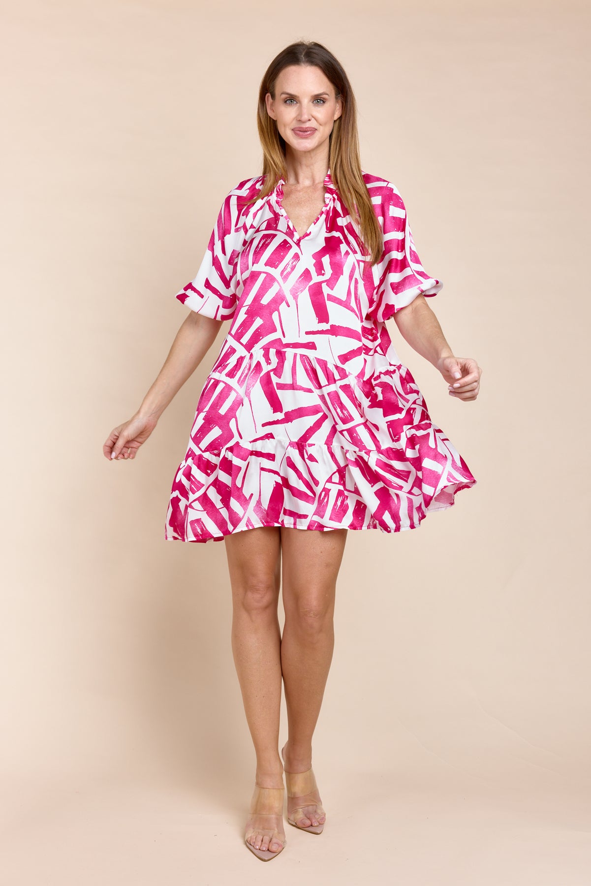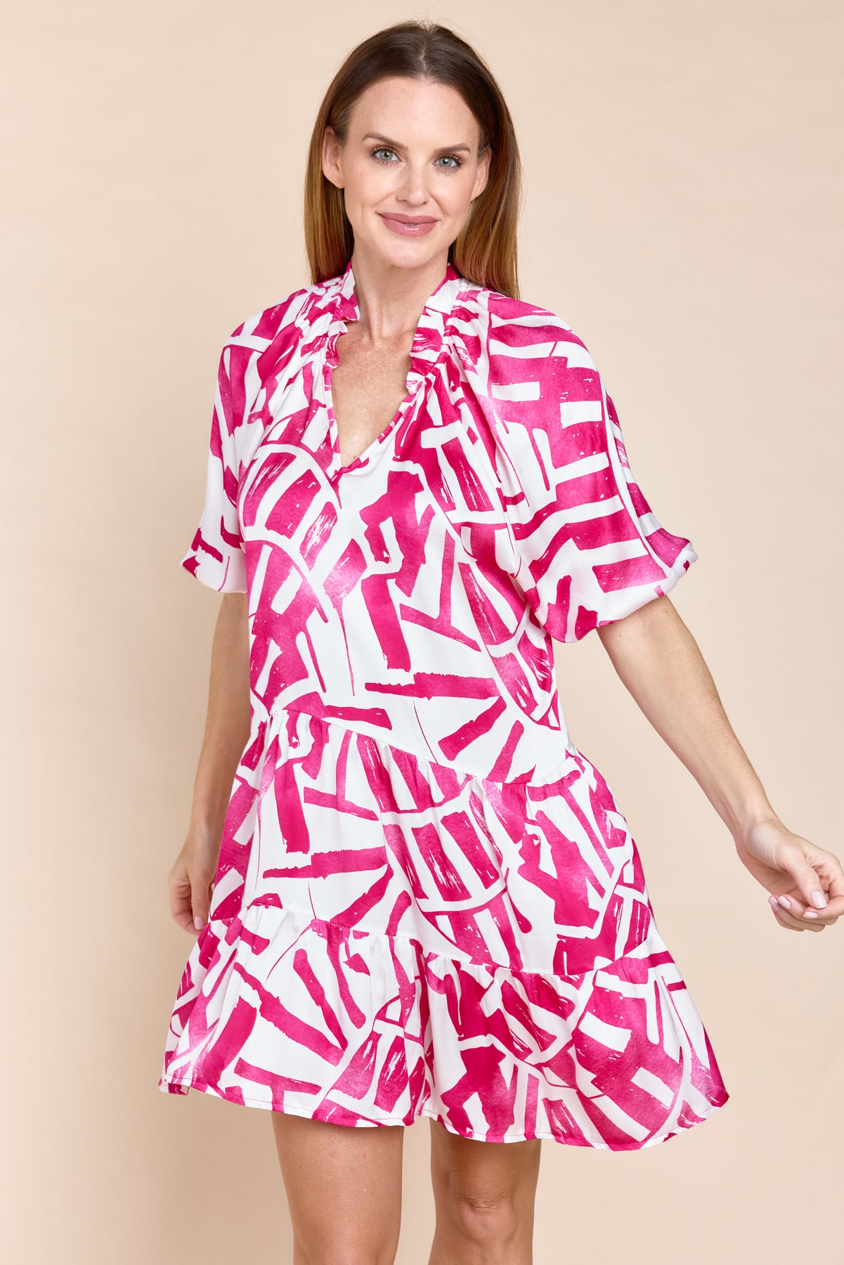 The dress is designed for both comfort and bold style, featuring a flattering V-neckline with a delicate, gathered ruffle stand collar and relaxed short sleeves with a gentle puff. The easy-fitting bodice flows into a playful tiered mini skirt, adding movement and contemporary texture. This dress is a testament to the bold, quality design that is truly synonymous with fashion authentically made in Italy.