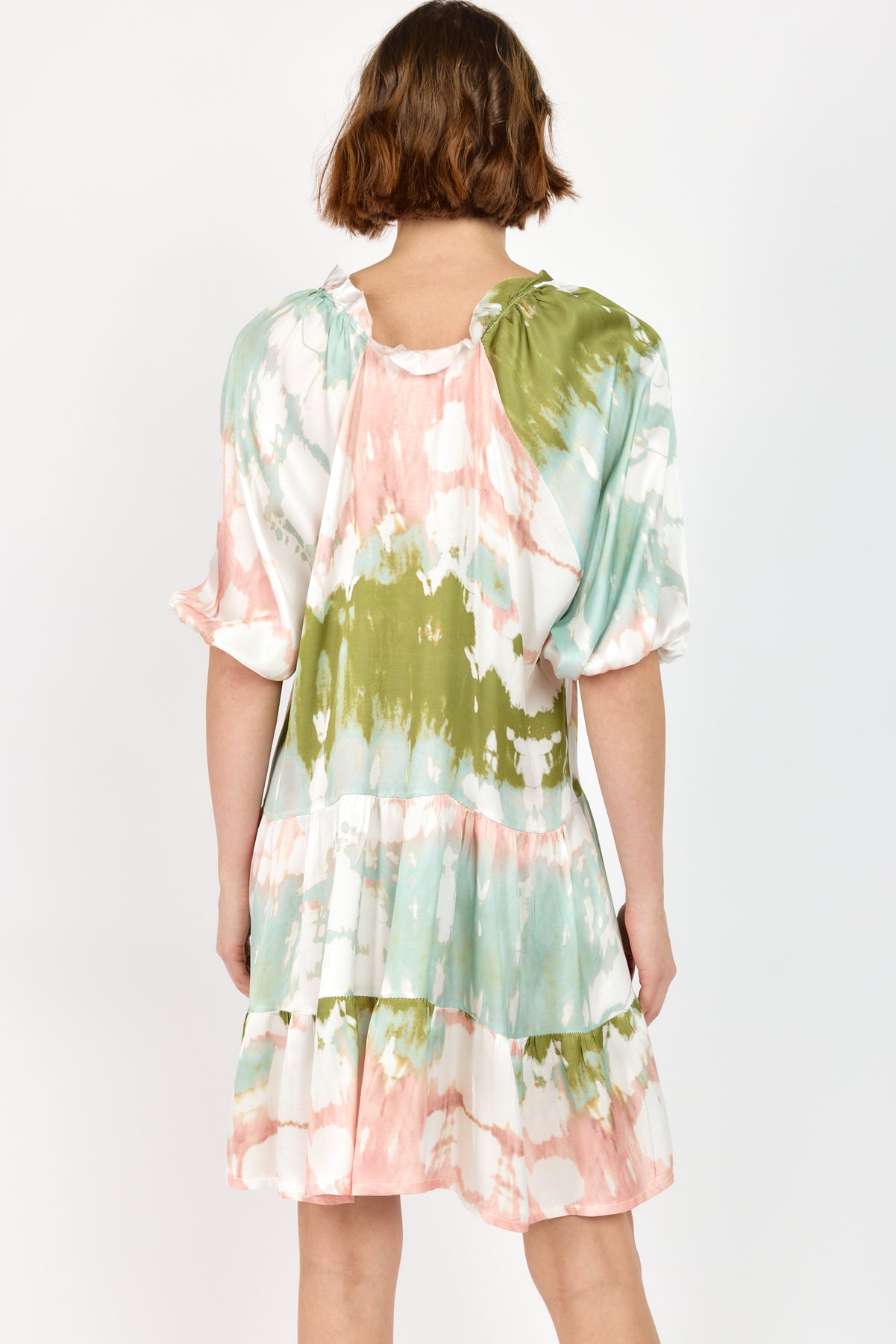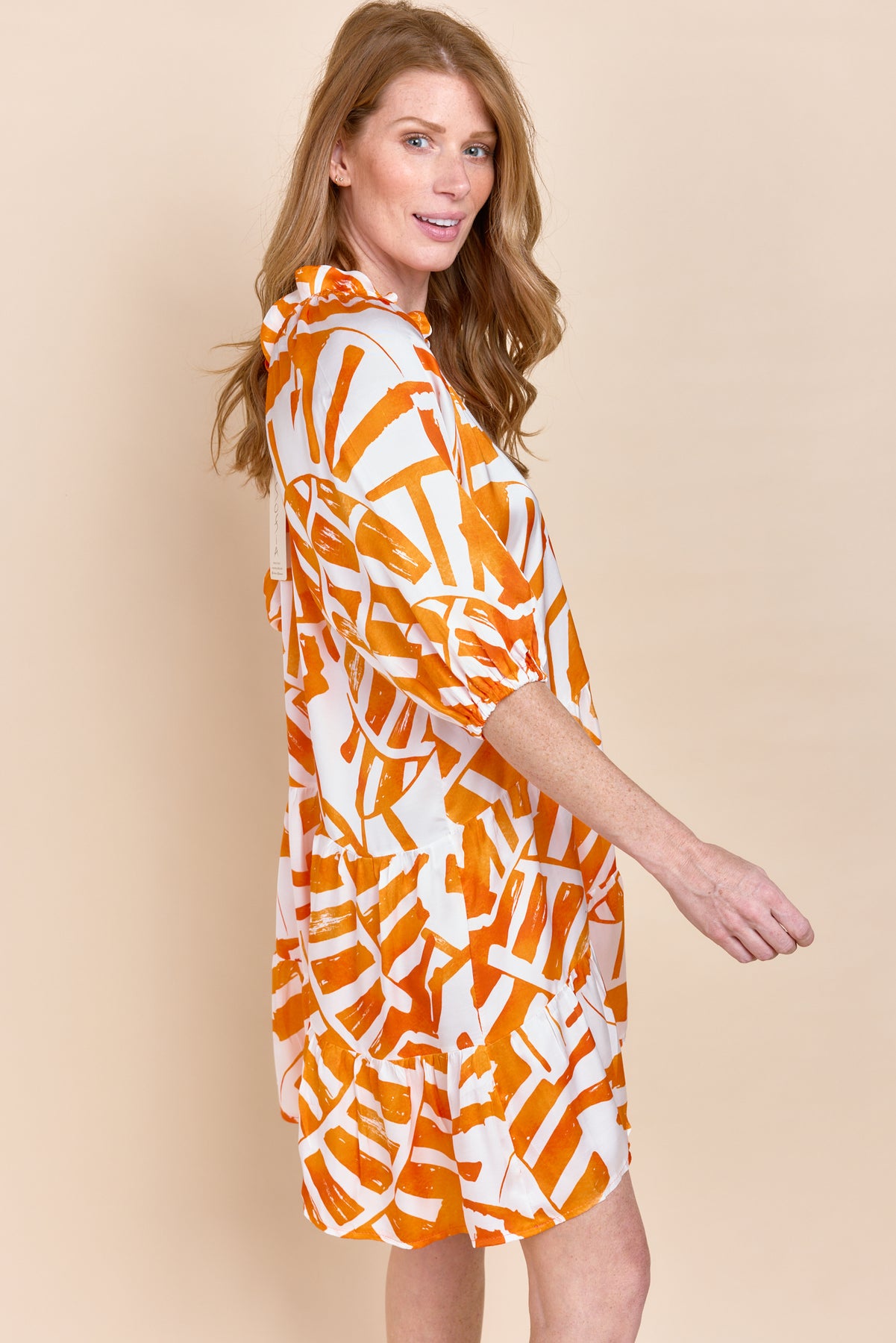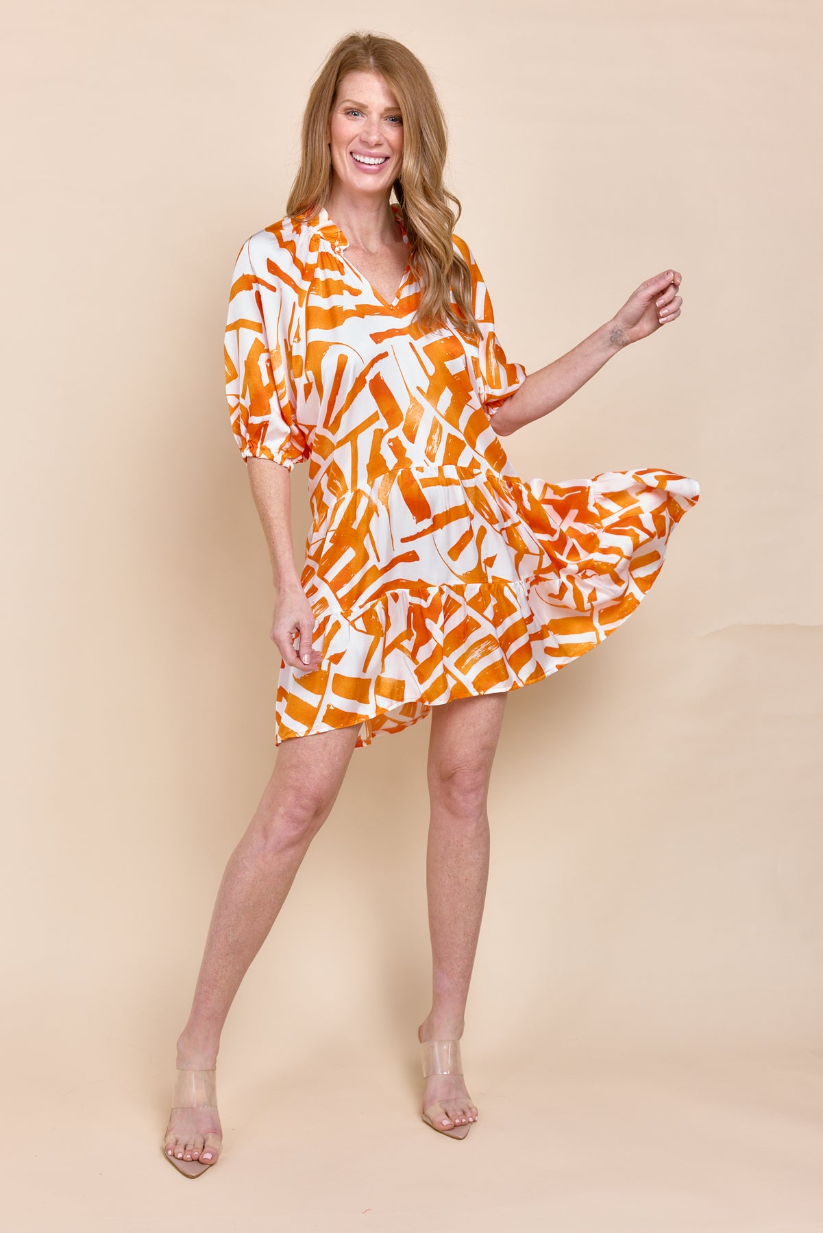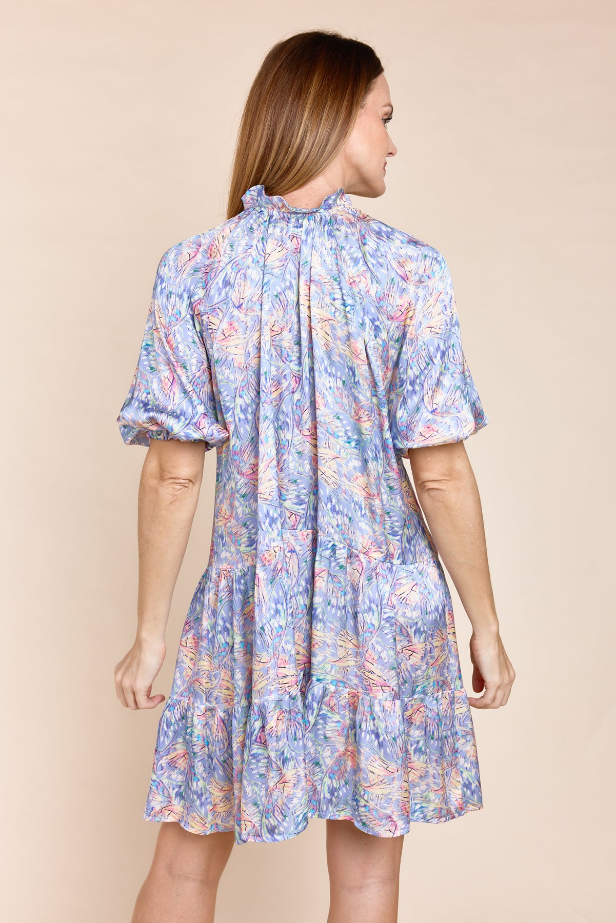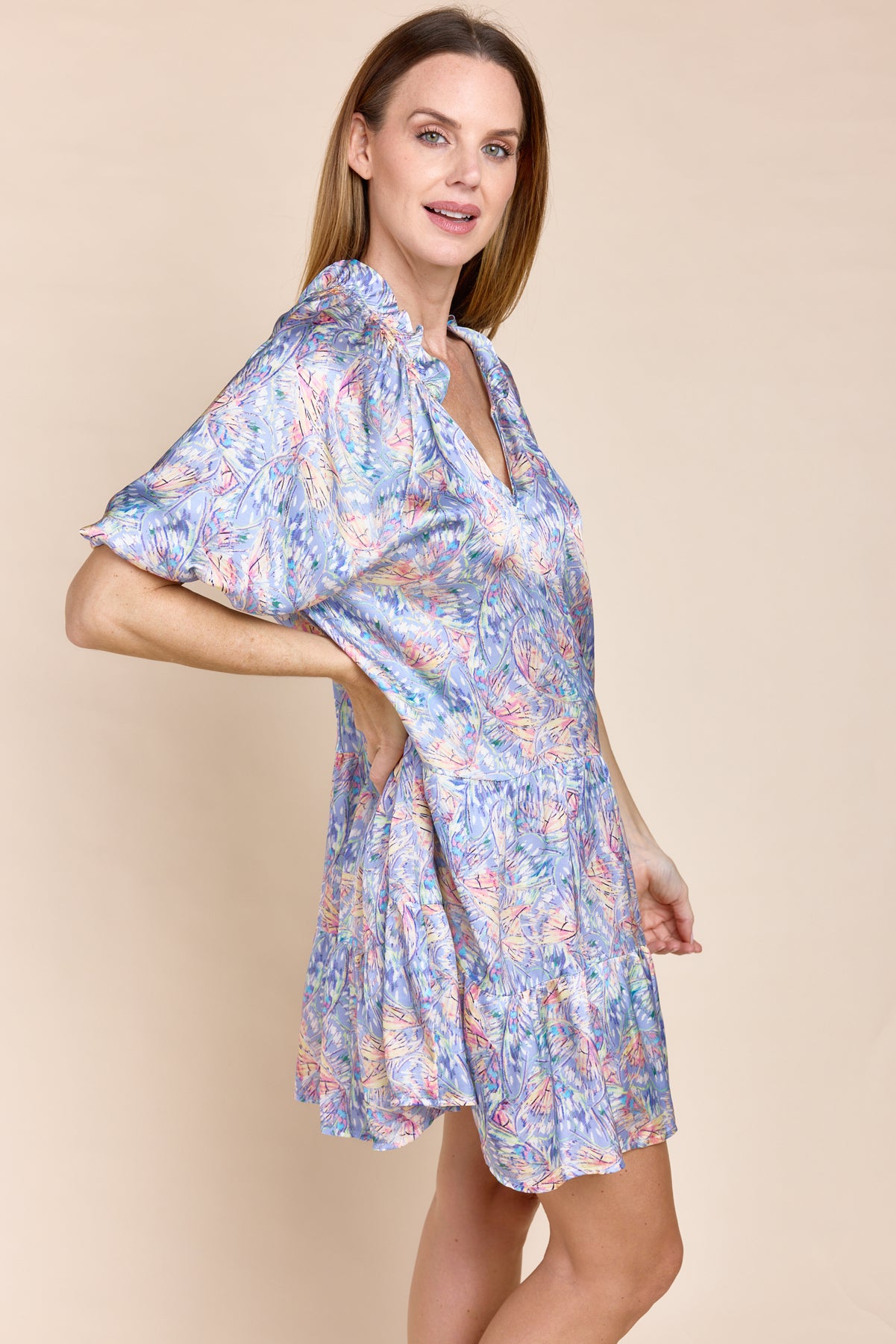 The dress is designed for both comfort and bold style, featuring a flattering V-neckline with a delicate, gathered ruffle stand collar and relaxed short sleeves with a gentle puff. The easy-fitting bodice flows into a playful tiered mini skirt, adding movement and contemporary texture. This dress is a testament to the bold, quality design that is truly synonymous with fashion authentically made in Italy.