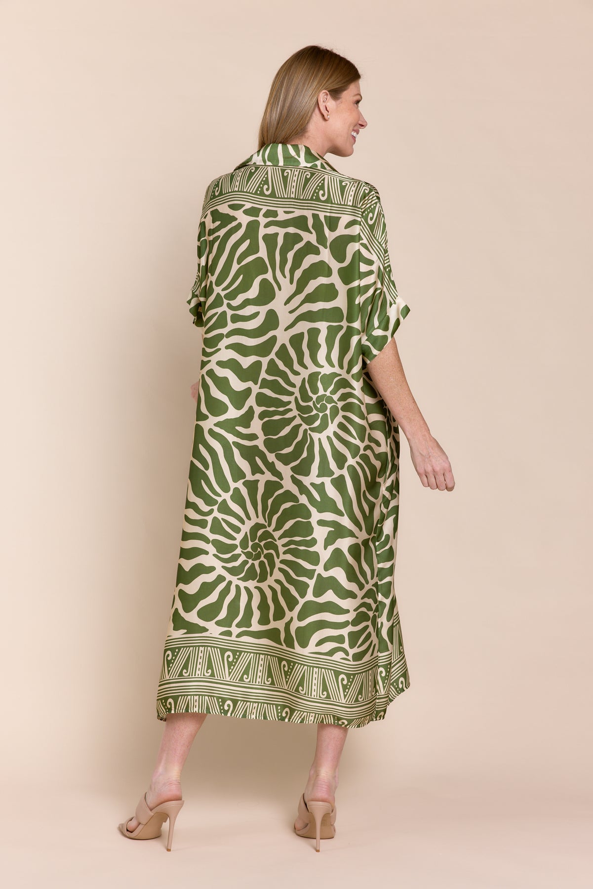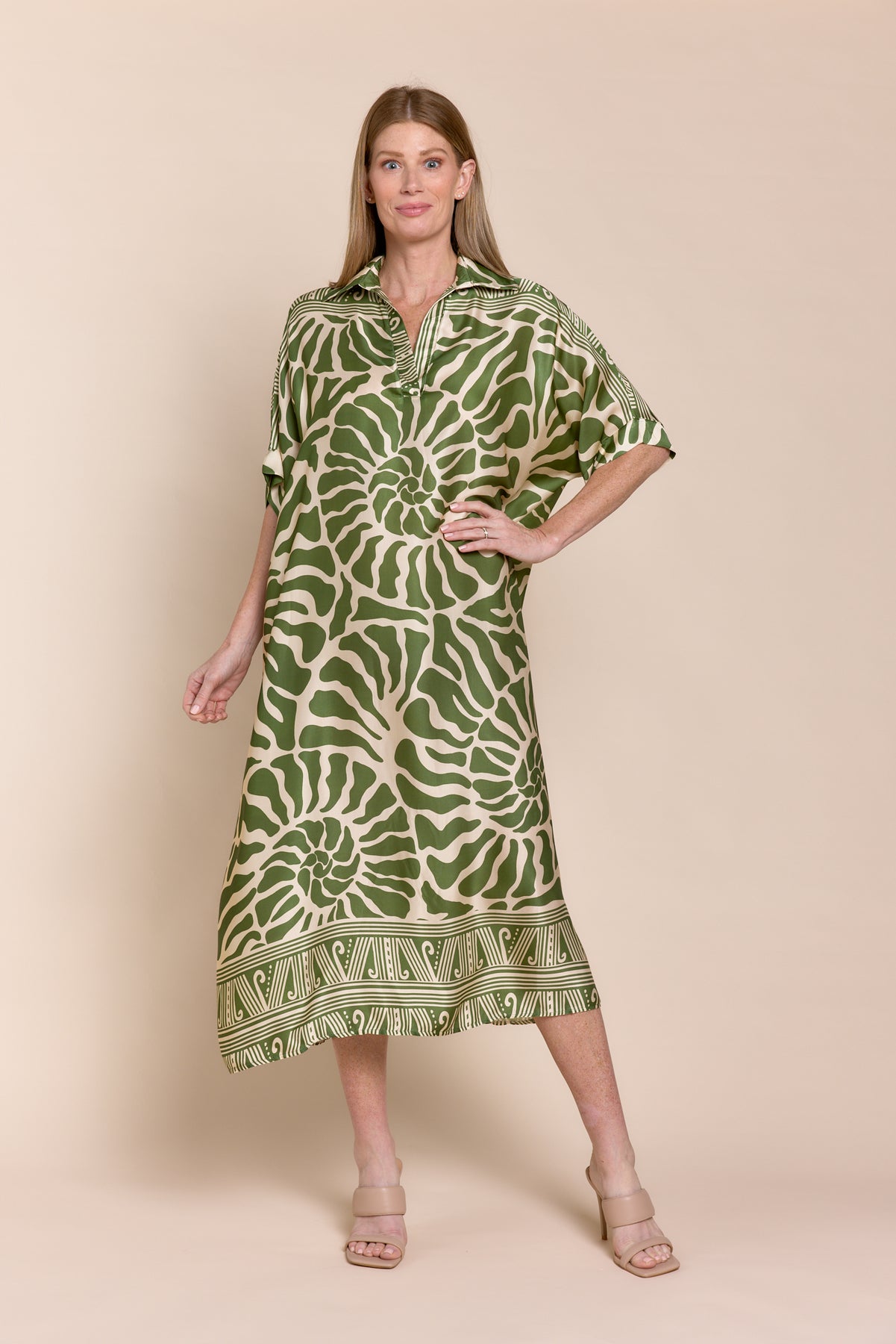 The dress features a chic, relaxed shirt-dress silhouette, modernized by an elevated animal-inspired print in beautiful shades of rich olive green and warm tan. The Italian satin fabric offers a beautiful sheen and a sophisticated, non-clingy drape that moves gracefully with you. Details include a classic shirt collar, a partial button placket, and comfortable short sleeves. Falling to a versatile midi length, this dress is an effortless statement piece perfect for a polished office look or an upscale casual event. Experience the comfort and refined quality that only a garment genuinely made in Italy can offer.