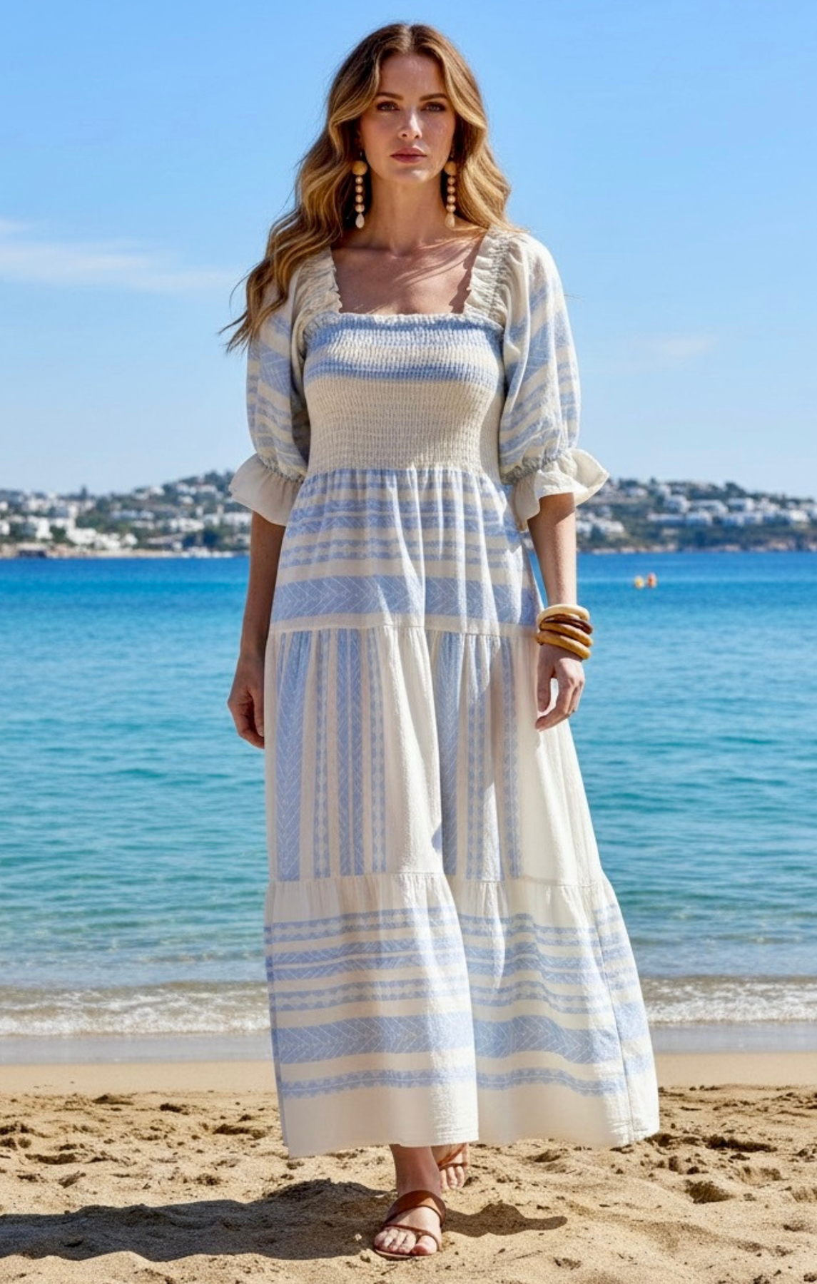 • Style: Midi/Maxi, Smocked Bodice, Tiered Skirt, Puff Sleeve