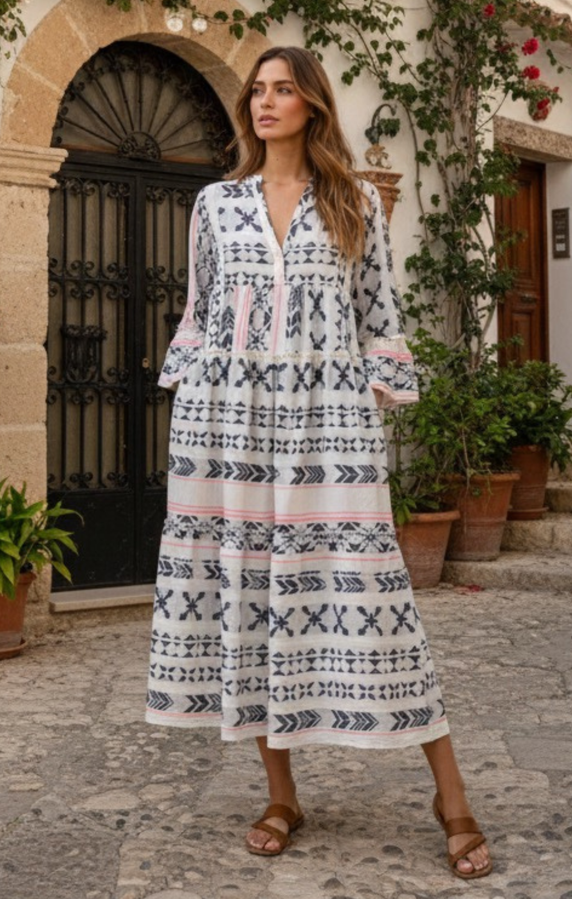 This dress is a boho-inspired, tiered midi dress made from lightweight fabric, It is designed with a relaxed fit, flowy silhouette, and a flattering V-neckline, accented by three-quarter bell sleeves for added movement and a feminine look. Perfect for spring and summer, this breezy piece combines comfort with style for casual, resort, or beach occasions.