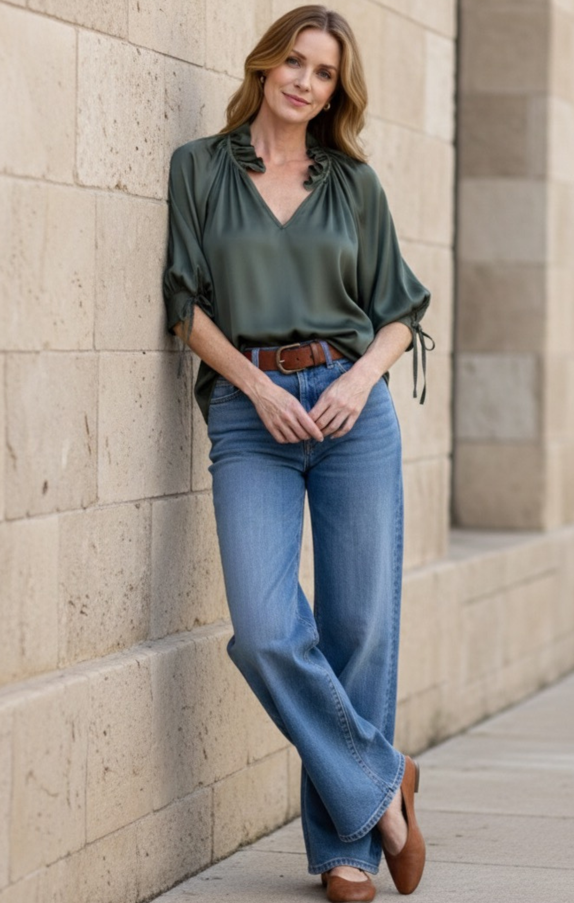 This top features a beautiful V-neckline accented by a delicate, feminine ruffled collar detail, adding texture and romance to the design. The sleeves are cut to a flattering three-quarter length with generous volume, ending in stylish, adjustable tie cuffs. This detail allows you to customize the sleeve length and gather for a more voluminous puff.