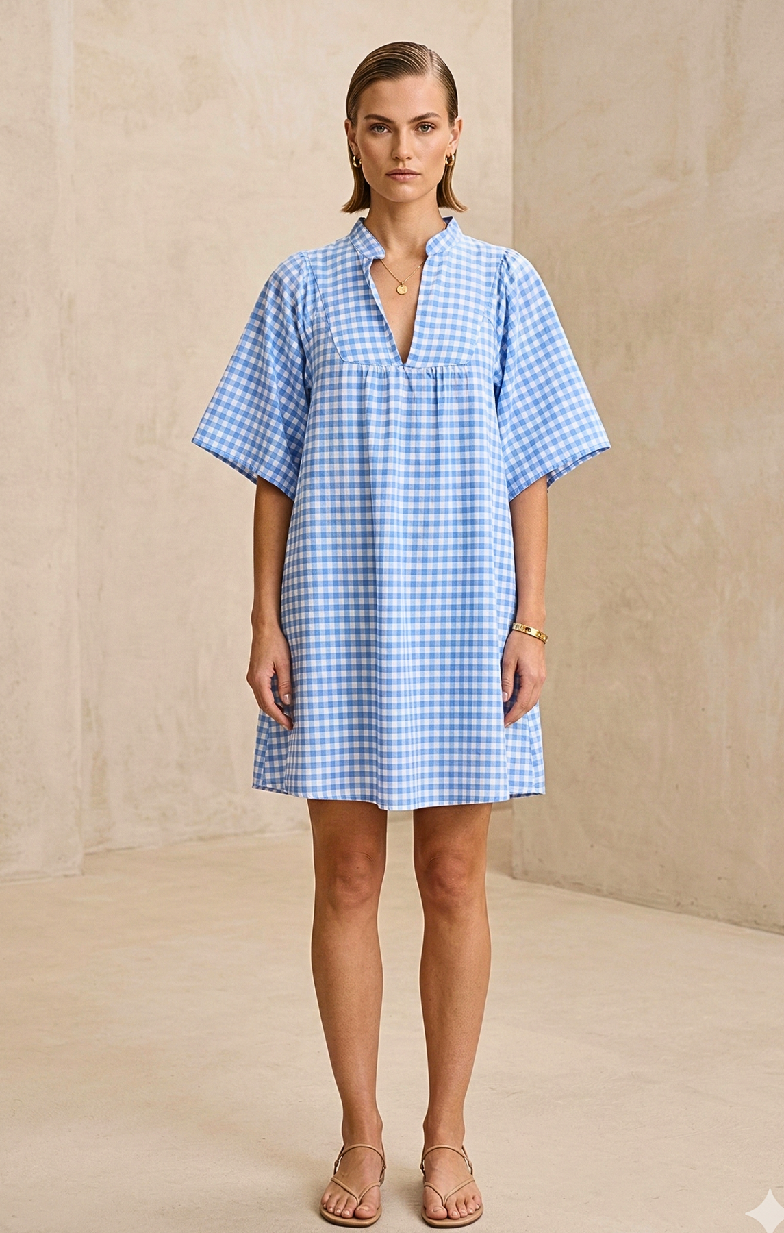 Crafted from lightweight, breathable cotton blend fabric, the dress features a classic blue and white checkered pattern that evokes a sense of serene, organic style. The relaxed babydoll silhouette offers an airy, effortless fit, while the subtle V-neckline and slightly structured collar add a touch of sophisticated utilitarian detail.