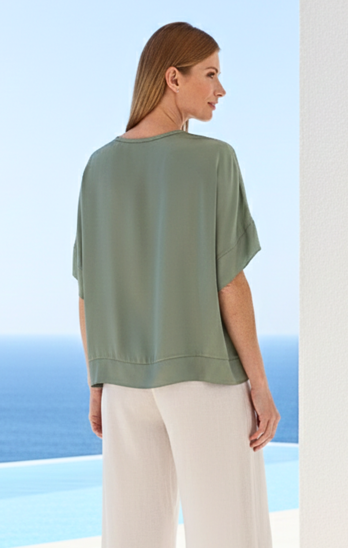 Elevate your everyday wardrobe with our Silk-Satin Relaxed Blouse. Crafted from a premium, satin fabric, this top offers a sophisticated drape that moves beautifully with you. The calming sage green hue provides a refreshing alternative to neutrals, while the shimmering satin finish adds a touch of understated glamour.