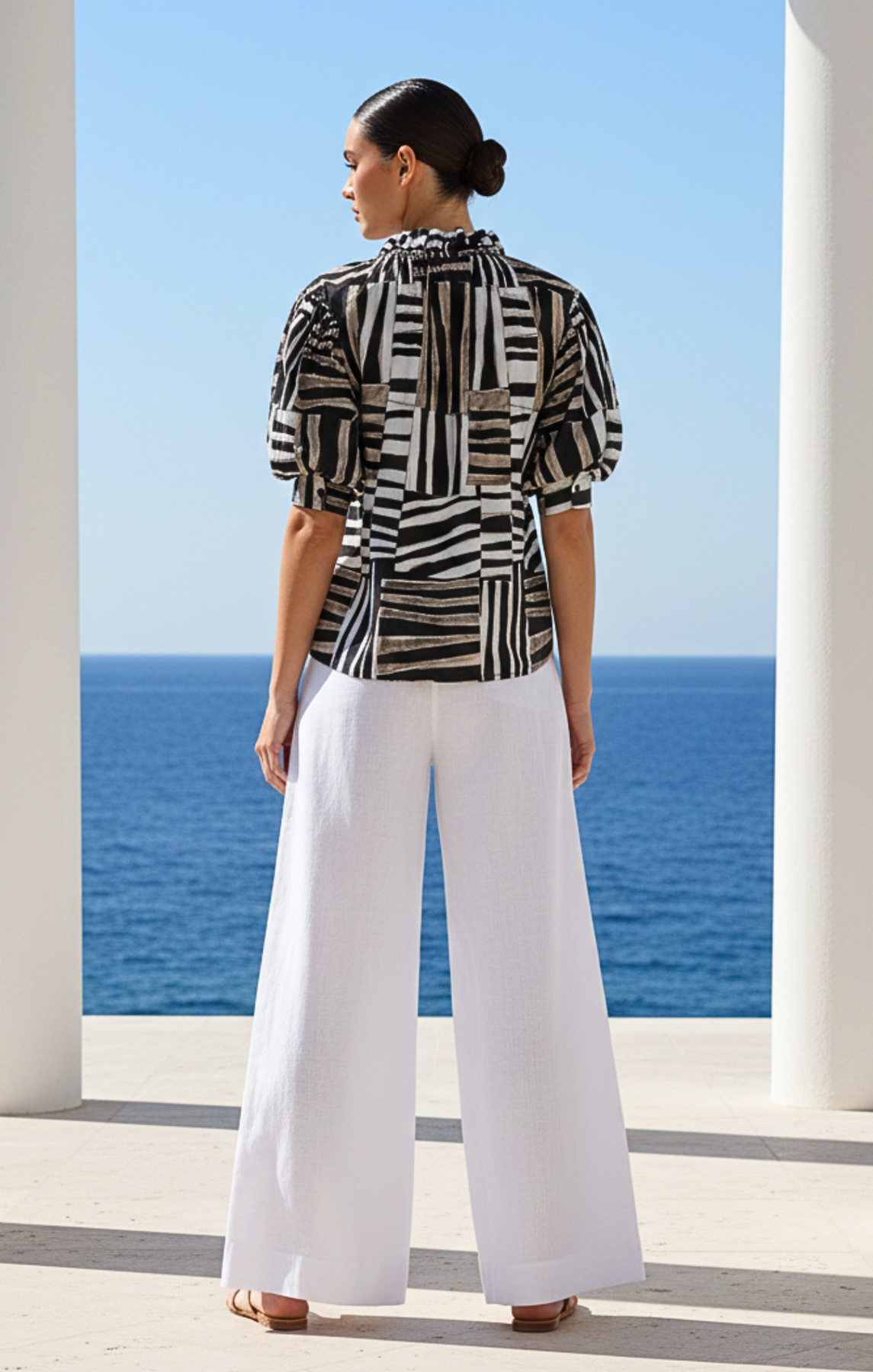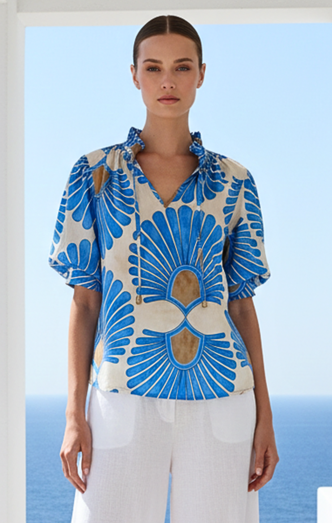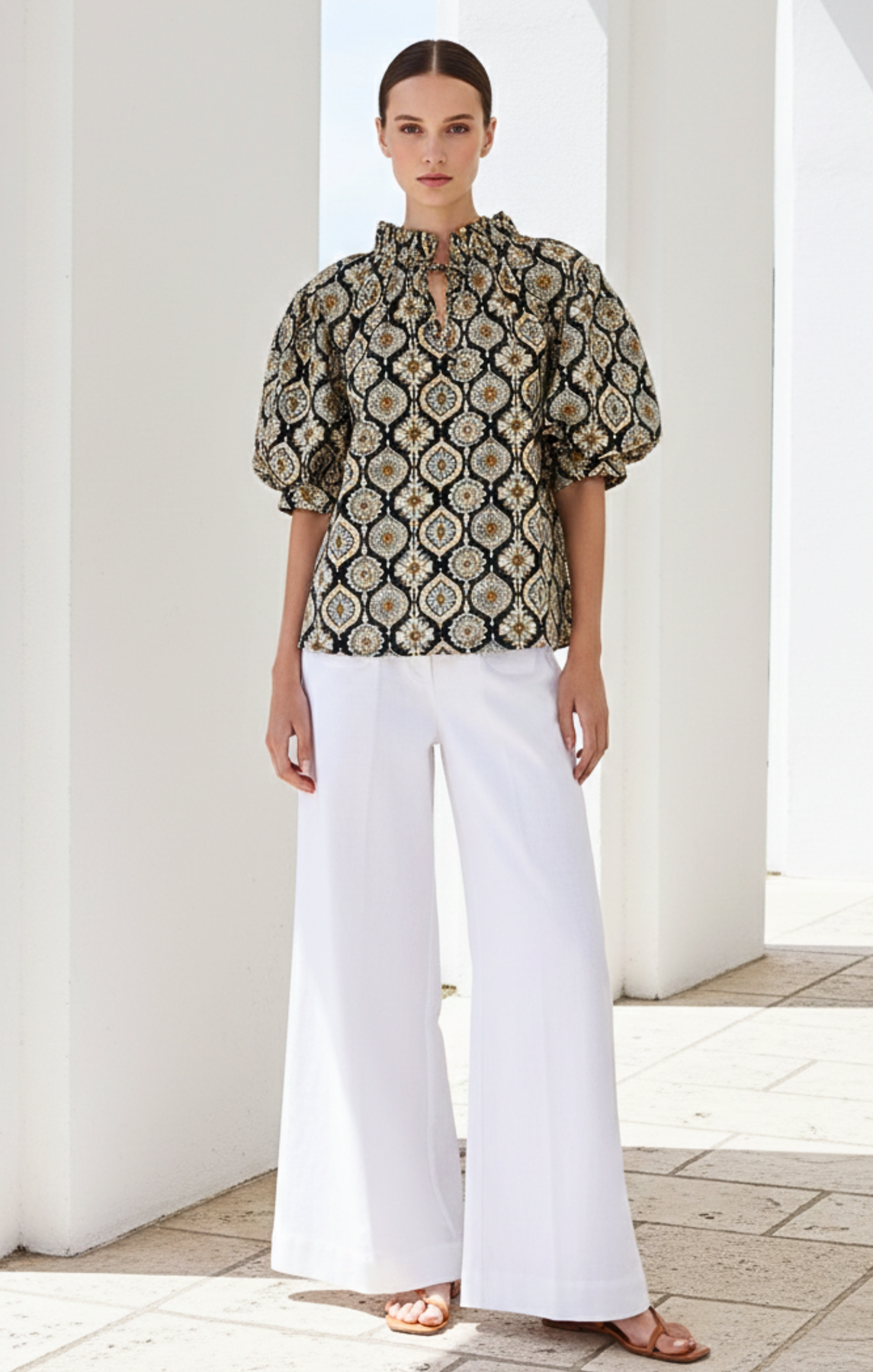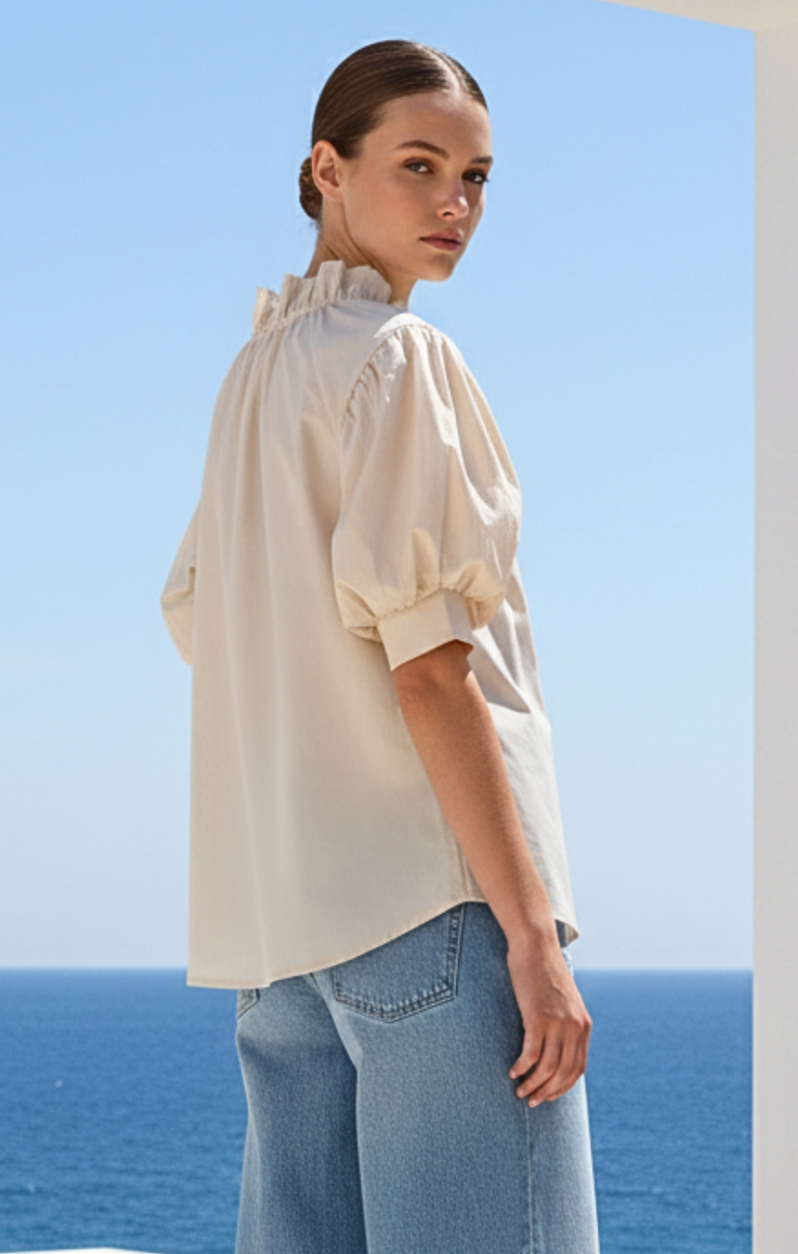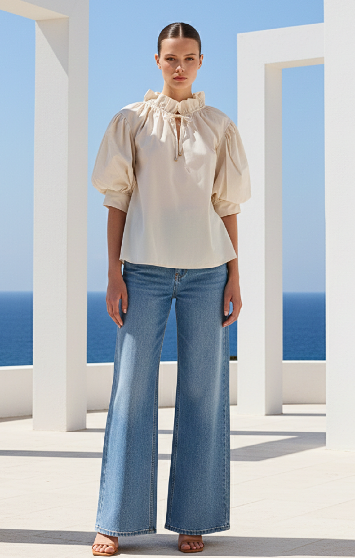 Elevate your wardrobe with this sophisticated Bohemian Puff-Sleeve Blouse, designed for the modern minimalist. The high ruffled neckline with delicate tie detailing and voluminous elbow-length puff sleeves create a structured yet feminine silhouette.