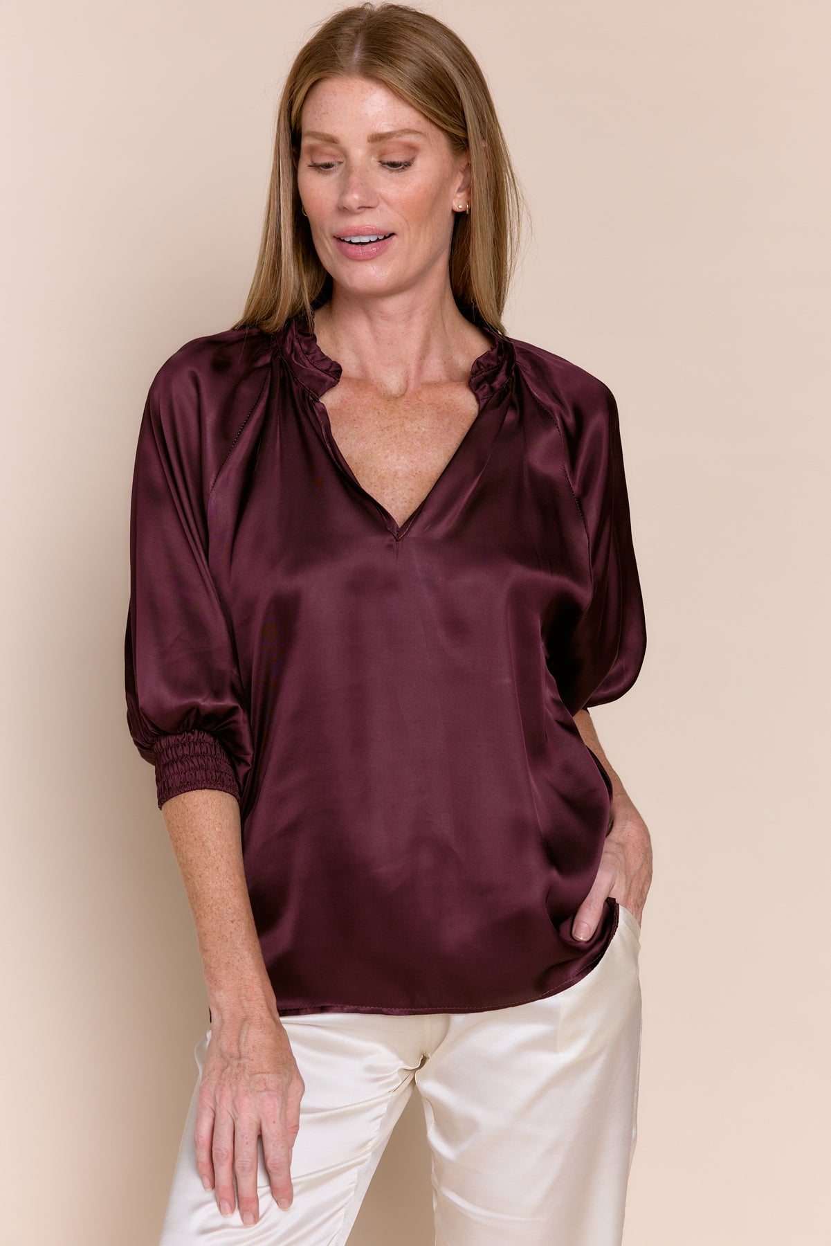 Andrea features a V-neckline three quarter, elastic sleeves. Made of Italian light weight silky satin, Perfect for both casual and dressy occasions.