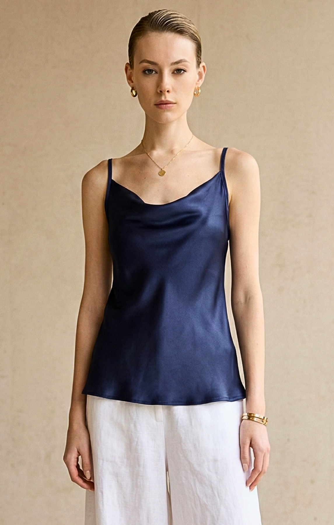 Elevate your essentials with a pop of high-octane color. This chartreuse silky satin camisole is designed to capture the light and the room, blending a minimalist silhouette with a bold, modern hue. Crafted from premium, soft silky satin, it features a fluid cowl neckline that creates a soft, sophisticated drape, elastic backline and adjustable straps Whether layered under a sharp blazer for a professional edge or paired with white linen shorts for a breezy summer evening, this top is the definition of "effortless chic." The delicate adjustable spaghetti straps and relaxed fit ensure all-day comfort without sacrificing style.Pair this vibrant piece with high-waisted neutral trousers and gold minimalist jewelry to let the color truly shine. For a more casual look, tuck it into light-wash denim and add a pair of strappy sandals.