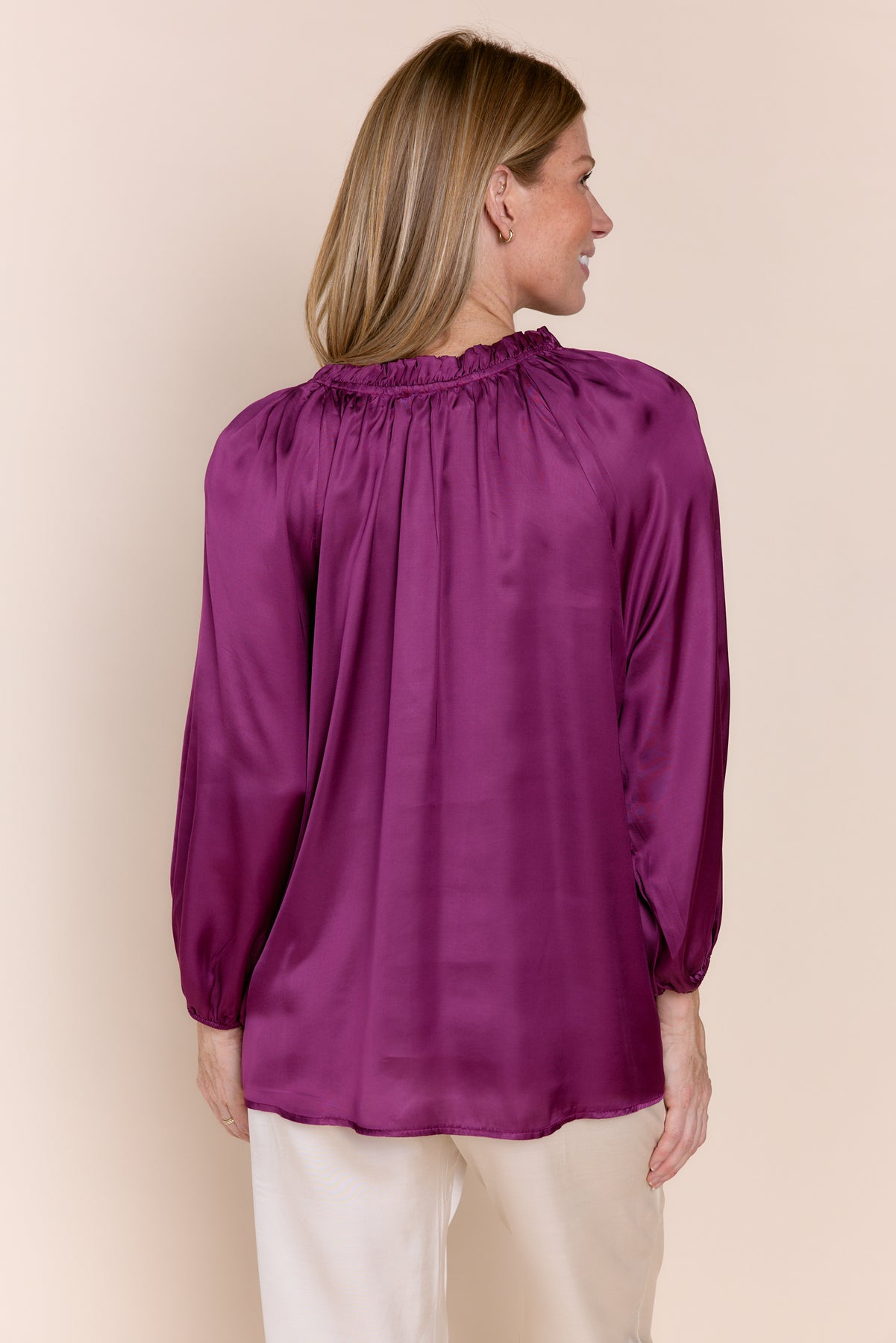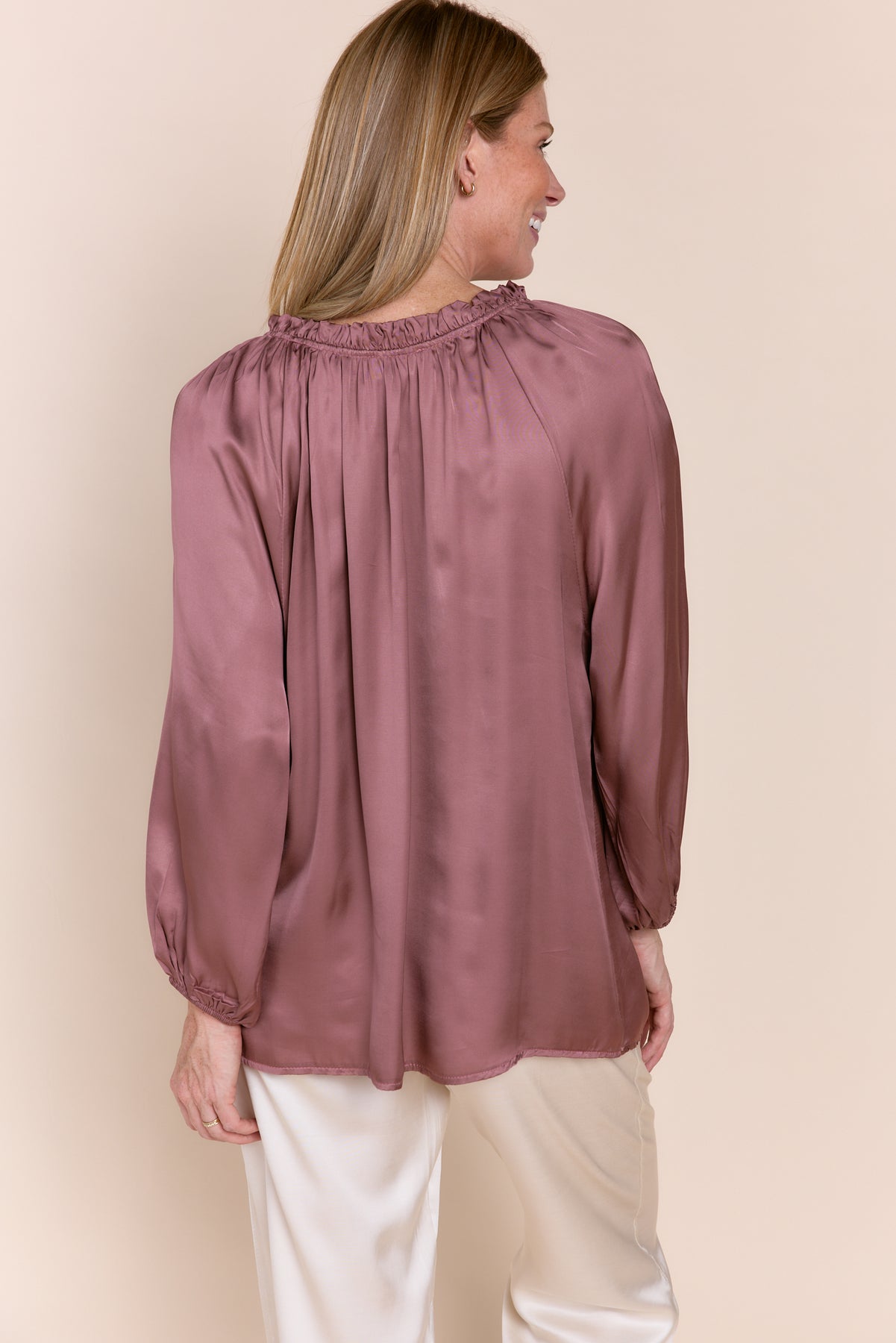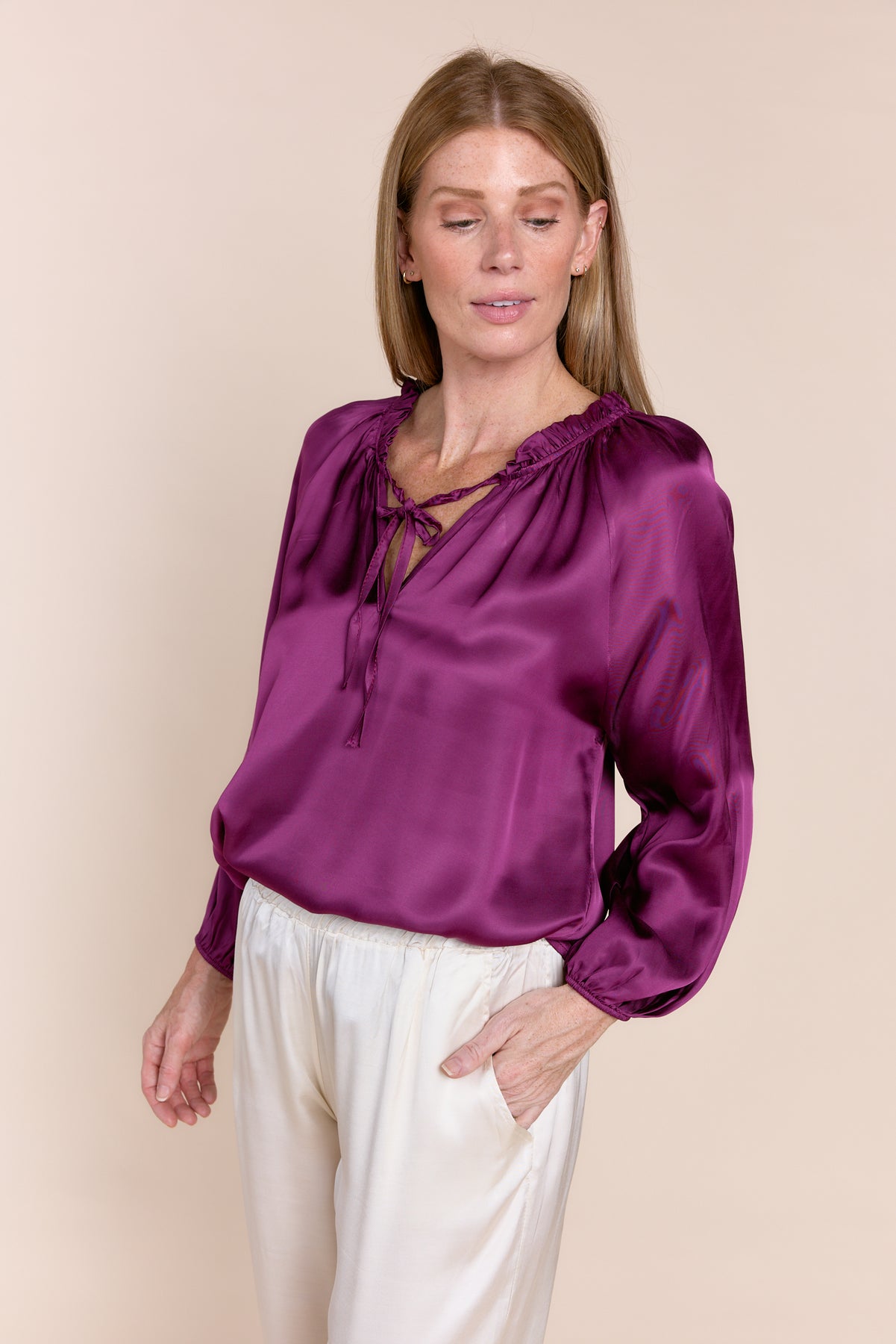 Elevate your wardrobe with our luxurious Gabriella satin Blouse. Features a beautiful tie-neck and elegant long sleeves. The perfect elegant silky  top for any occasion. Shop now!