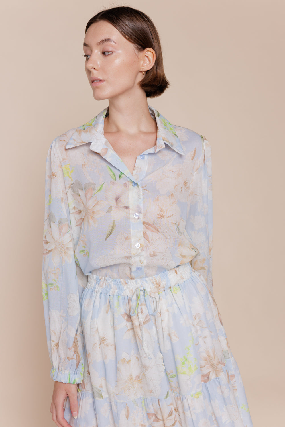 Discover understated charm with the Nicola blouse by Babette. Made from breathable cotton voile, this lightweight button-down comes in two delicate prints: Fleur de Lys, with soft shades of blue, beige, and lime, and Chinon, a neutral blend of cream and beige tones. A classic collar and white button front add structure. Designed with long sleeves that gentle gather at the cuffs, Nicola brings a graceful balance of refinement and wearability.