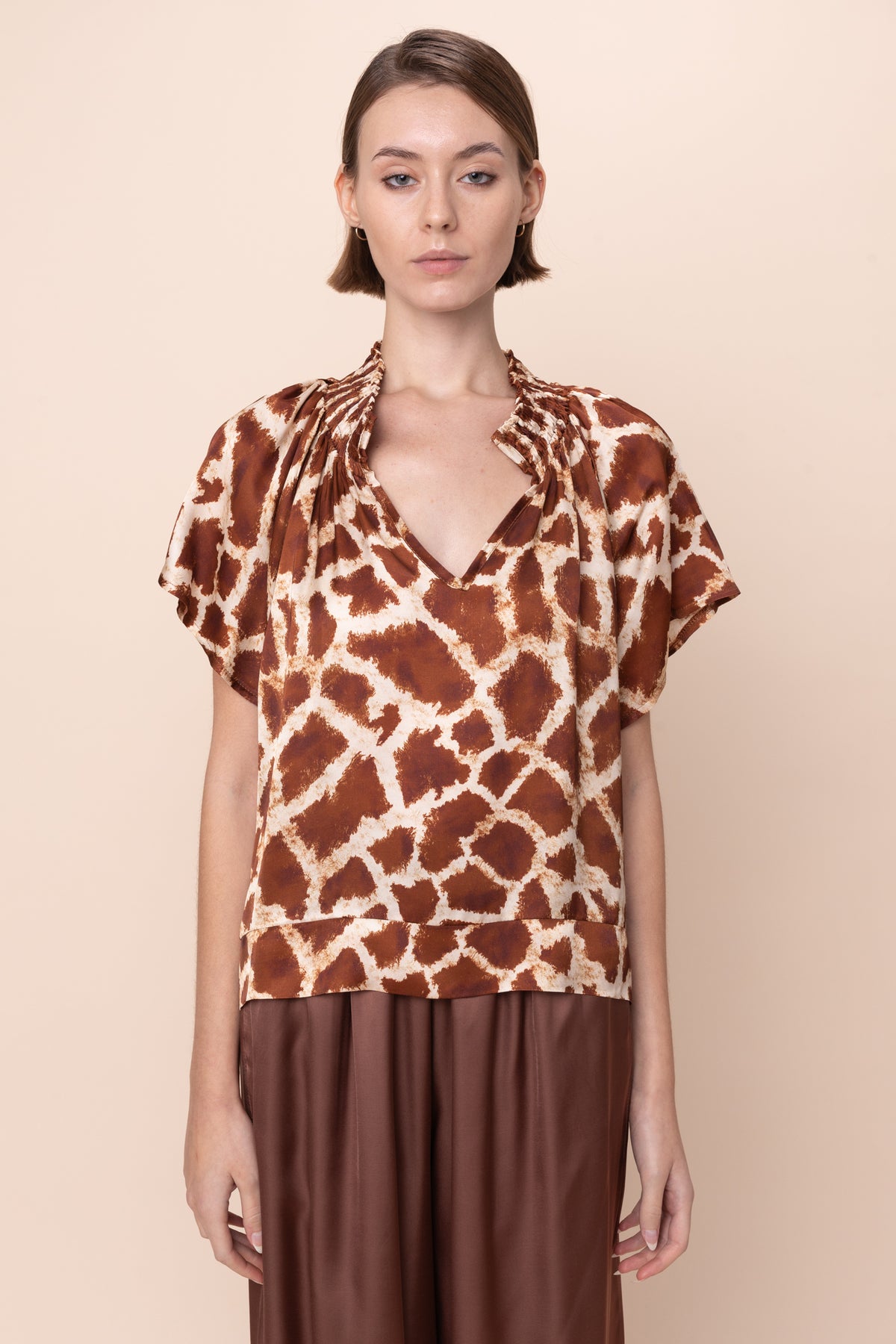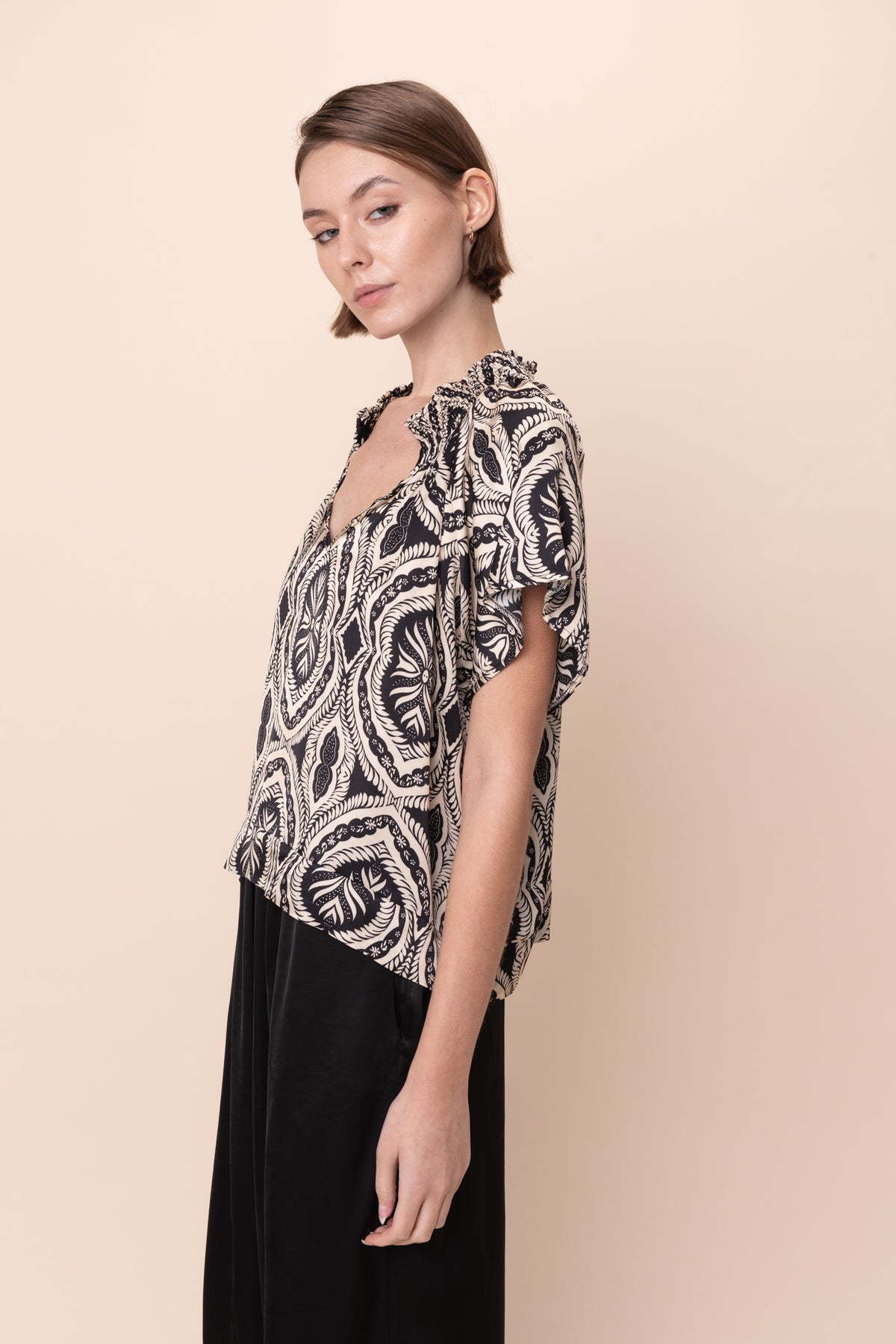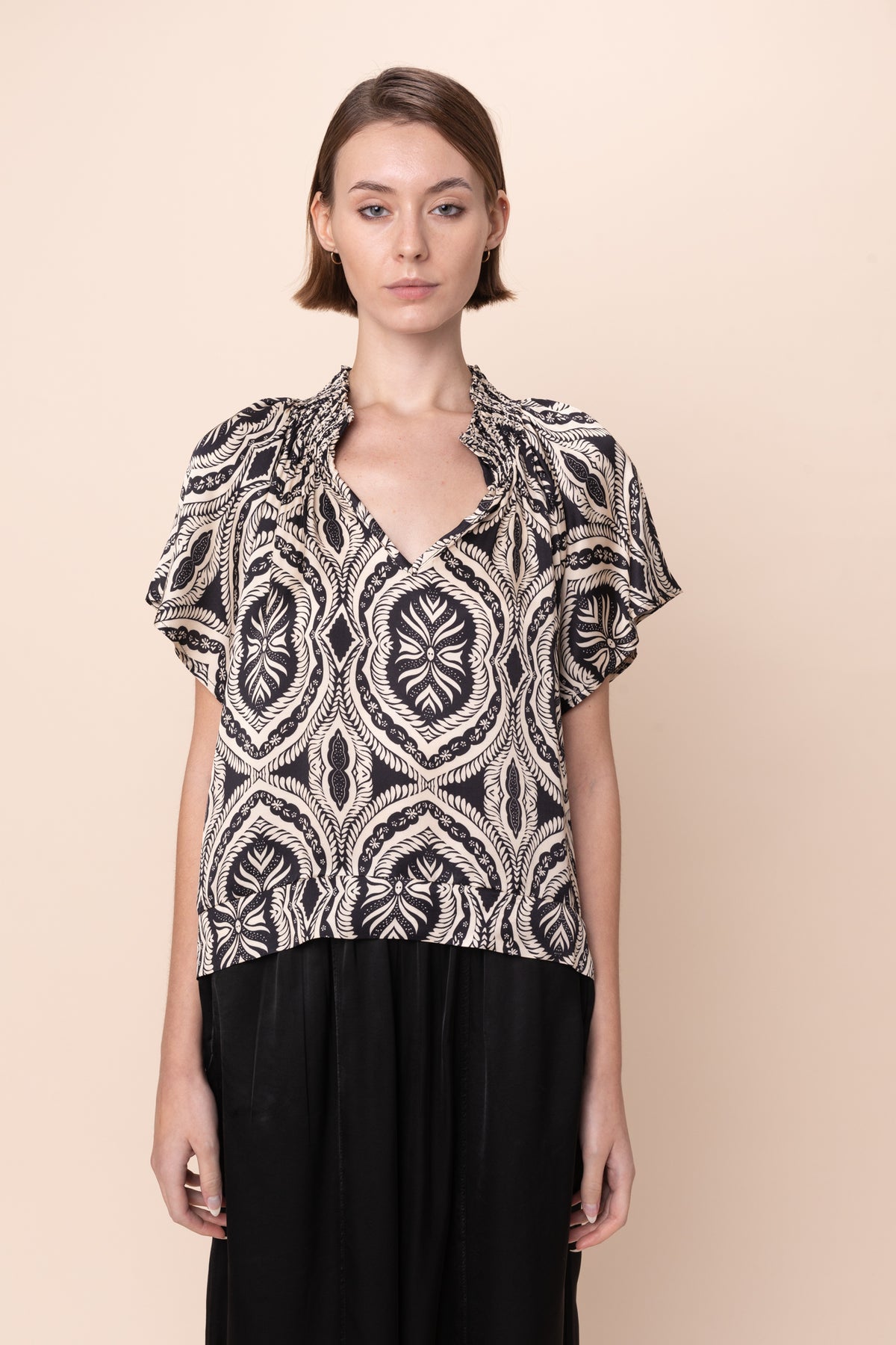 This chic top features a smocked, elastic V-neckline, short sleeves. Made from lightweight Italian poplin cotton.ideal for warm weather, Pair it with your favorite jeans , short or our cute Melanie mini skirt.