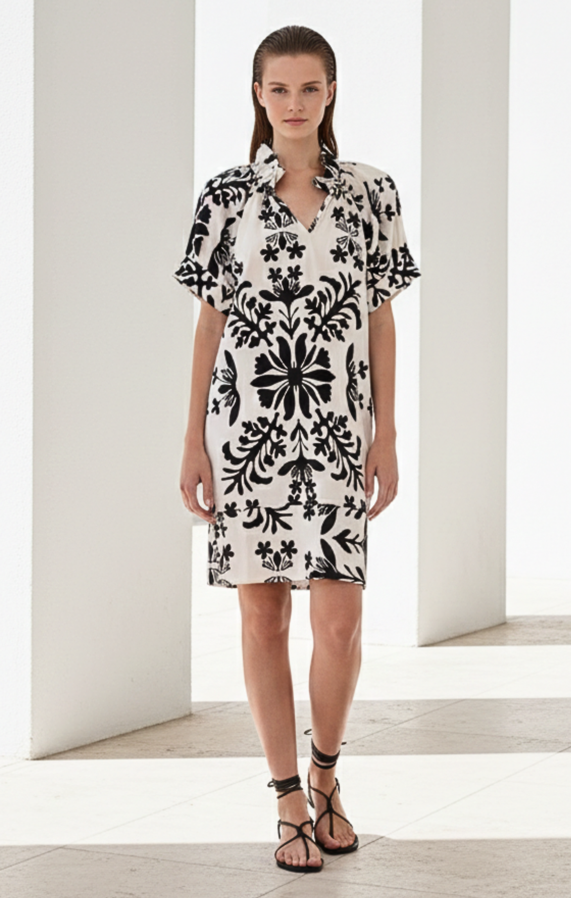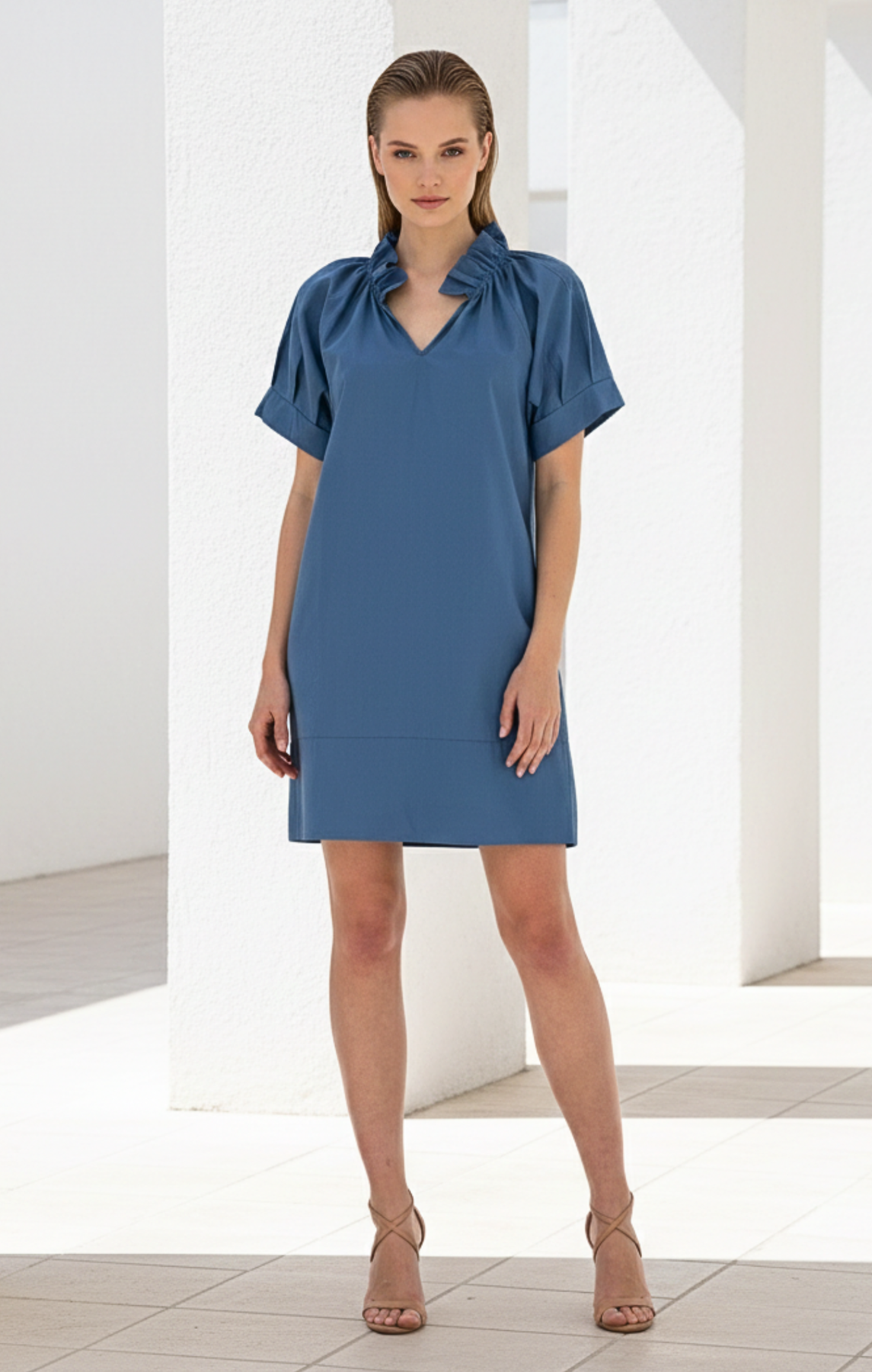 The relaxed, A-line shift silhouette is both chic and comfortable, skimming the body without restricting movement. Design features include a flattering V-neckline that leads up to a unique, gatheredruffle stand collar, adding a feminine touch. Voluminous, softly puffed short sleeves complete the playful yet sophisticated design. This dress is the ultimate warm-weather essential, reflecting the fresh, vibrant, and high-quality fashion that is genuinely made in Italy.