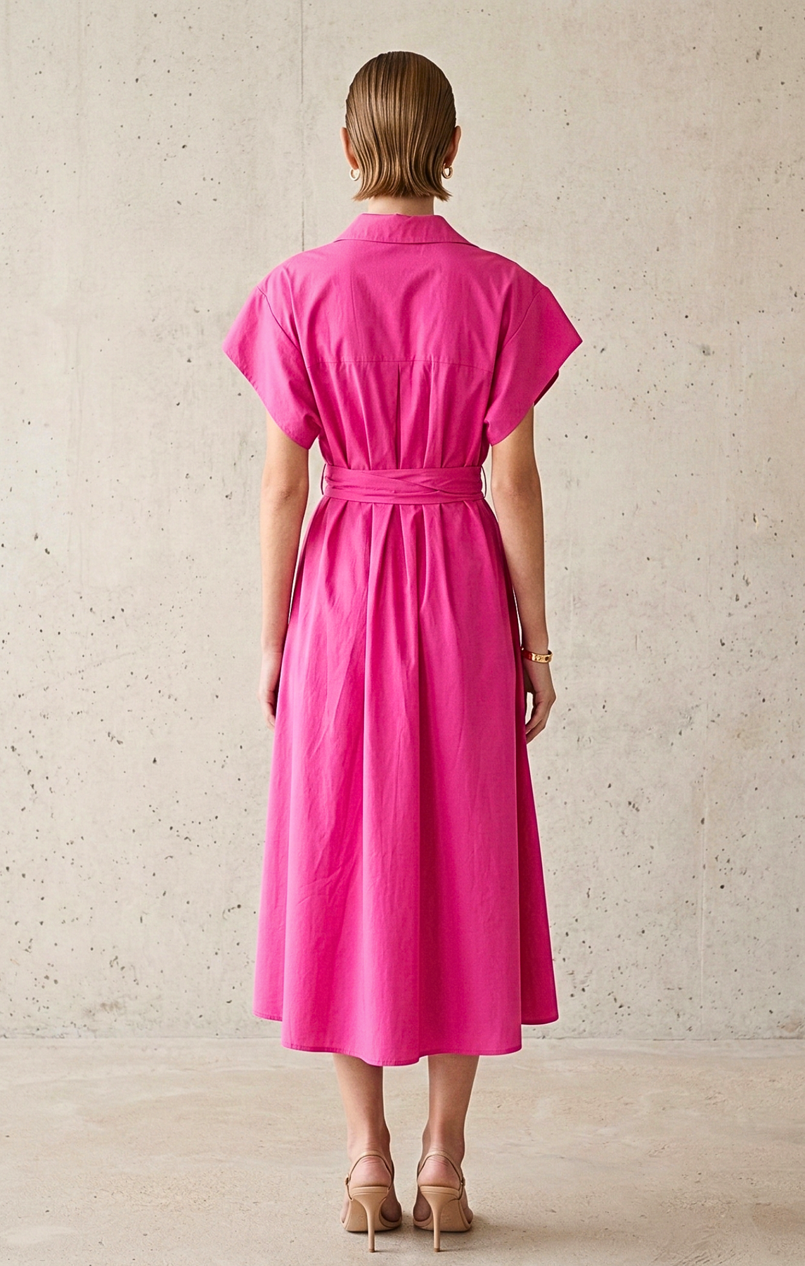 Make a statement in this striking Midi-Length Shirt Dress. Crafted from luxurious Organic Italian Cotton, this dress offers breathable comfort and a beautiful drape. It features a flattering V-neck collar, draped cap sleeves, and a long self-tie belt to cinch the waist. Effortlessly stylish and sustainably made, this premium garment is proudly made in Italy. Perfect for resort wear, sophisticated daytime events, or vibrant everyday style.
